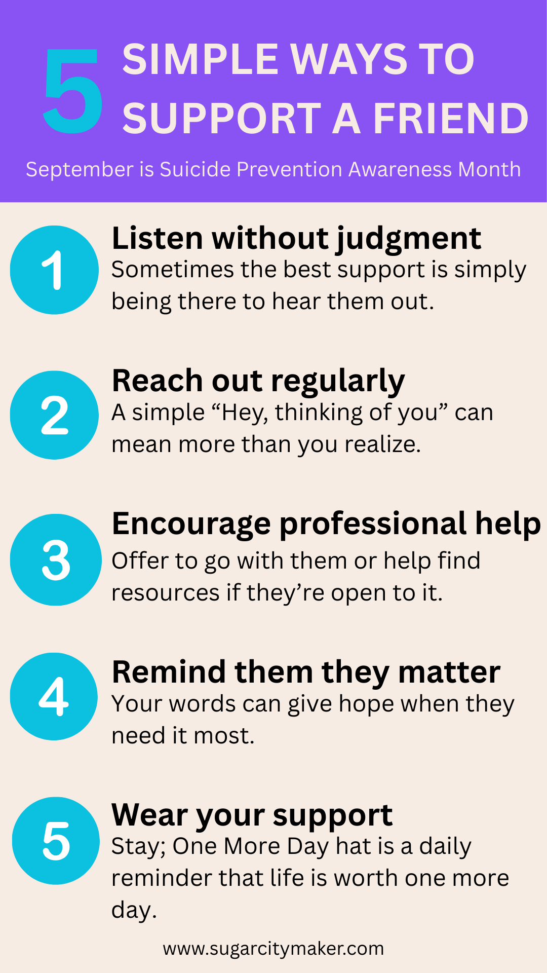 It's easy to underestimate how much words matter. Remind your friend that their life has meaning and that they are loved, valued and needed. A heartfelt note, a kind word, or even a small gesture can give hope in their hardest moments.