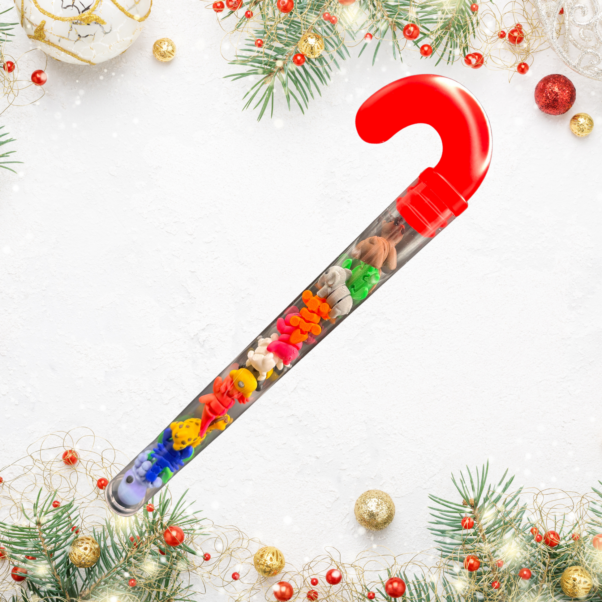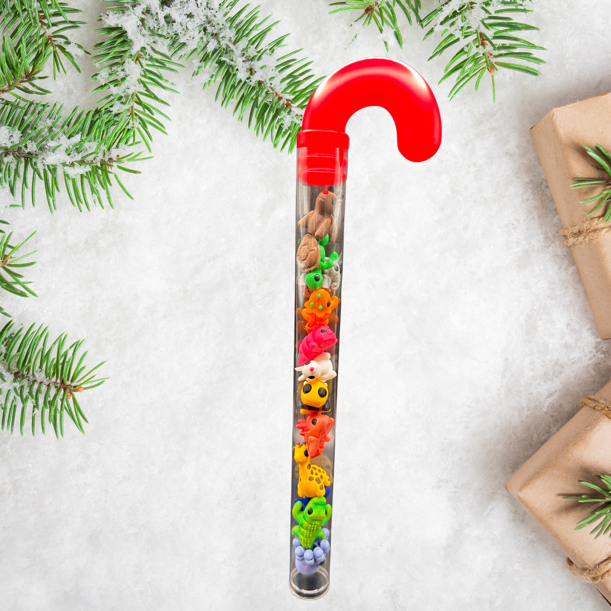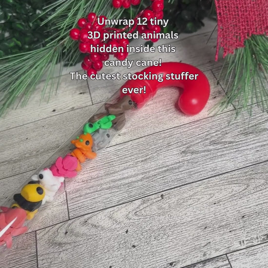 Bring some holiday magic to your gift giving with this 3D printed mini animals in a candy cane. Each clear candy cane (11.5" x 3") holds 12 unique, 1-inch 3D printed animals crafted with precision and full of personality.