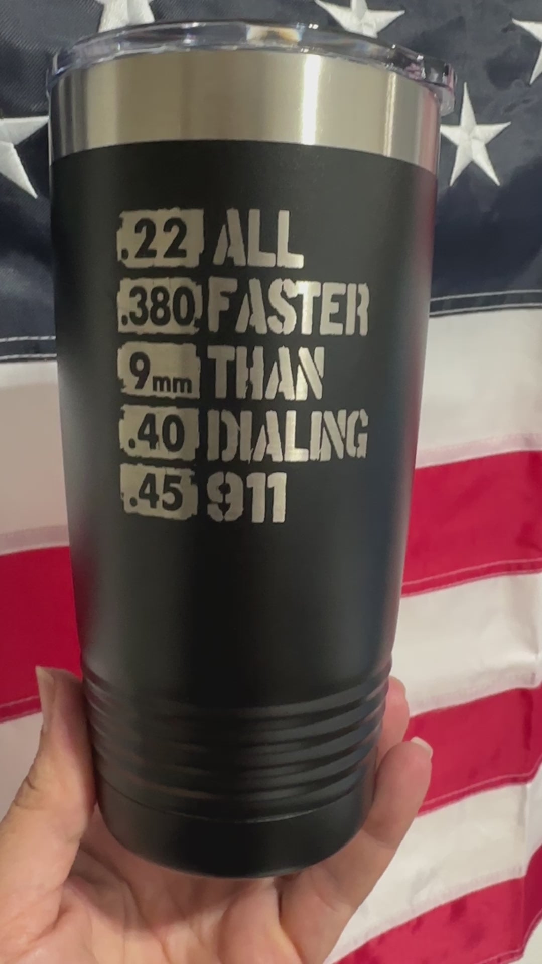 Introducing the 20 OZ Insulated Tumbler, featuring a powerful laser-engraved design that lists bullet sizes alongside the statement "All Faster than Dialing 911." This tumbler combines robust durability with a bold message, making it the ideal accessory for those who appreciate a blend of functionality and assertive style in their drinkware.