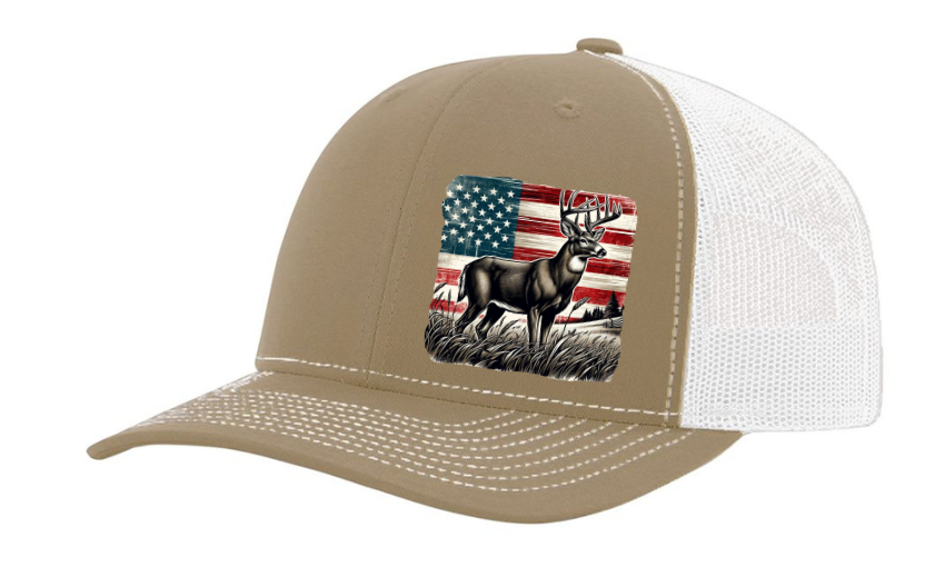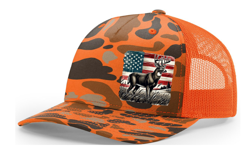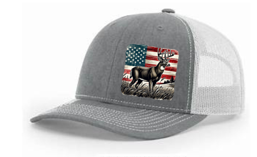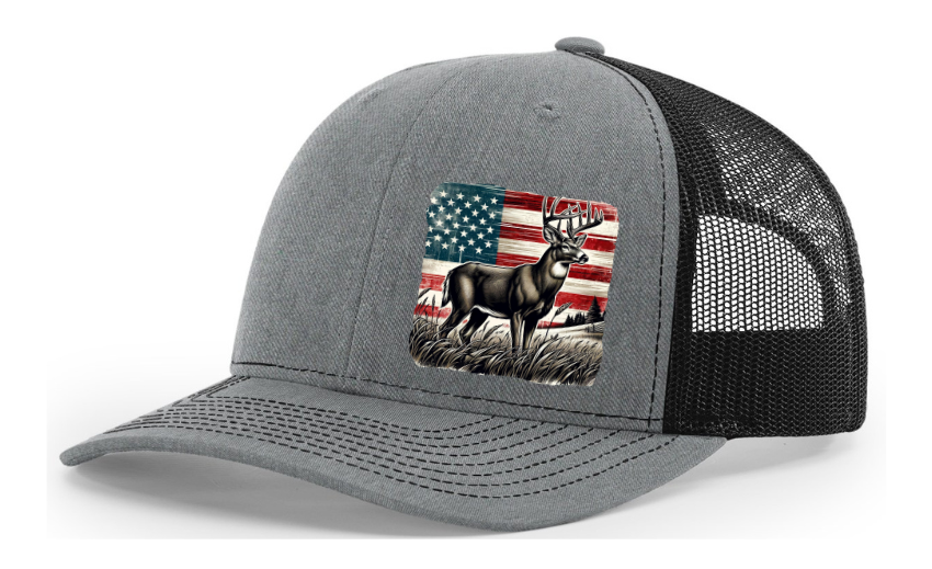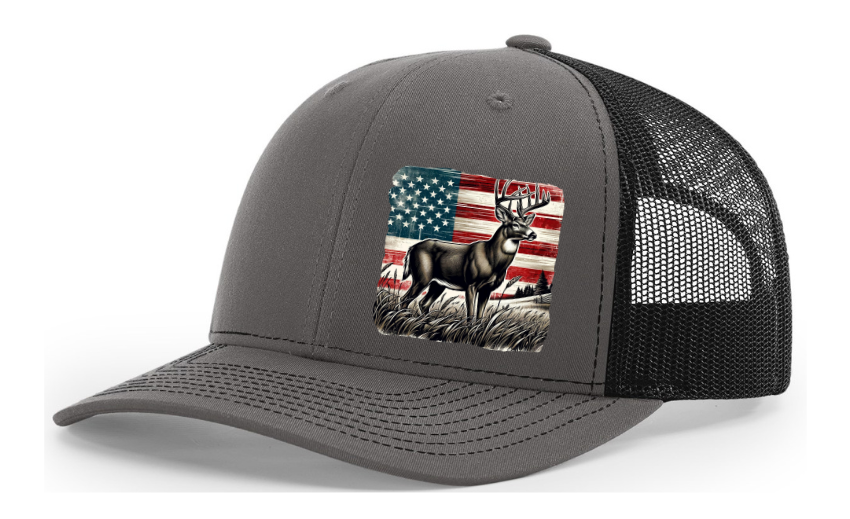 Embrace your love for the outdoors with this Richardson 112 snapback or FlexFit L/XL hat, featuring a striking full-color image of the American flag combined with a majestic deer. This hat is perfect for the rugged adventurer who carries both patriotism and a passion for nature. Available in a variety of colors—Charcoal/Black, Heather Grey/Black, Khaki/White, Heather Grey/Grey, and Green Camo—this hat is designed for those who appreciate quality, style, and a touch of the wild. Whether you're out in the field or enjoying a casual day, this hat makes a bold statement that blends your love for the land and the freedom it represents.