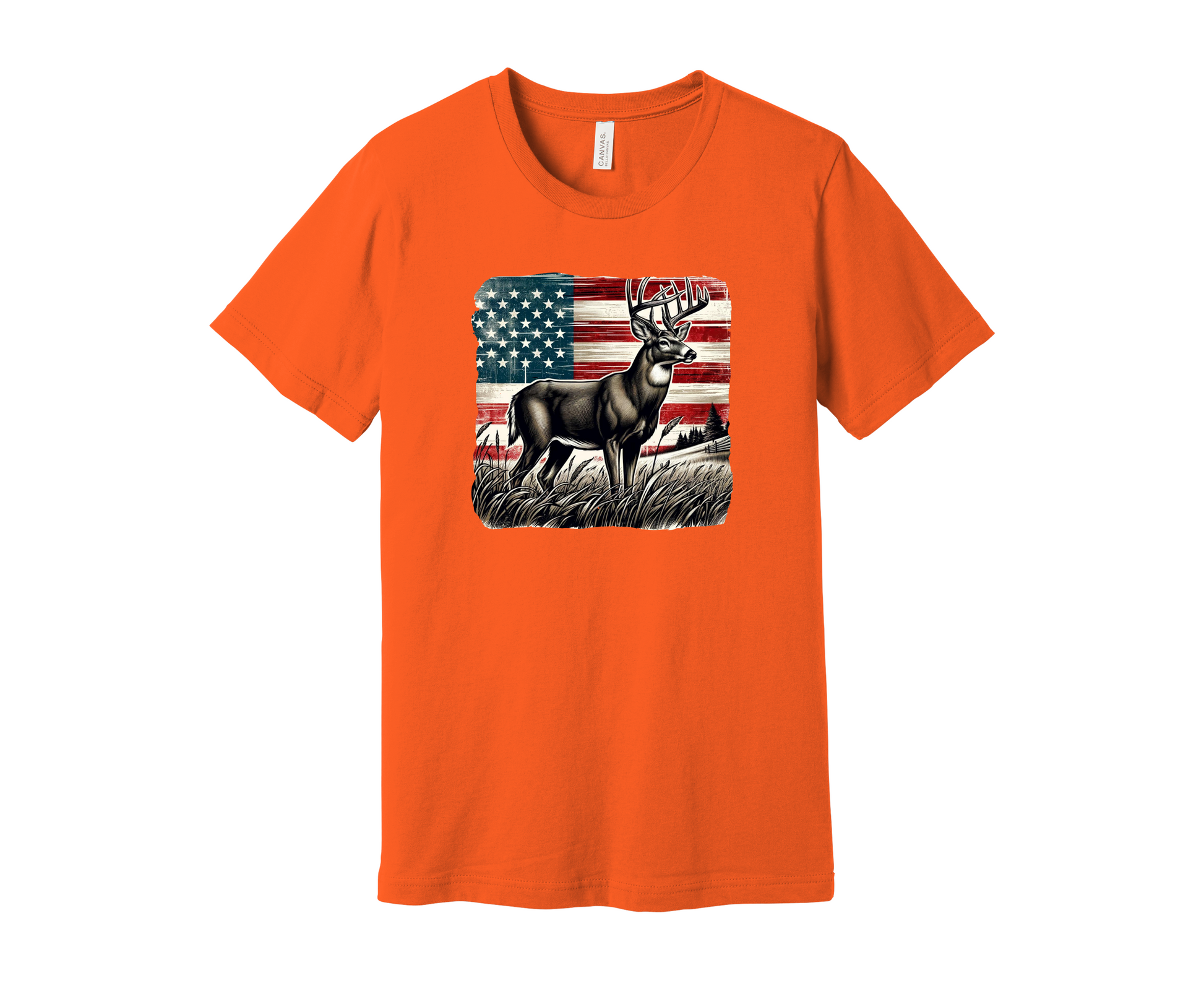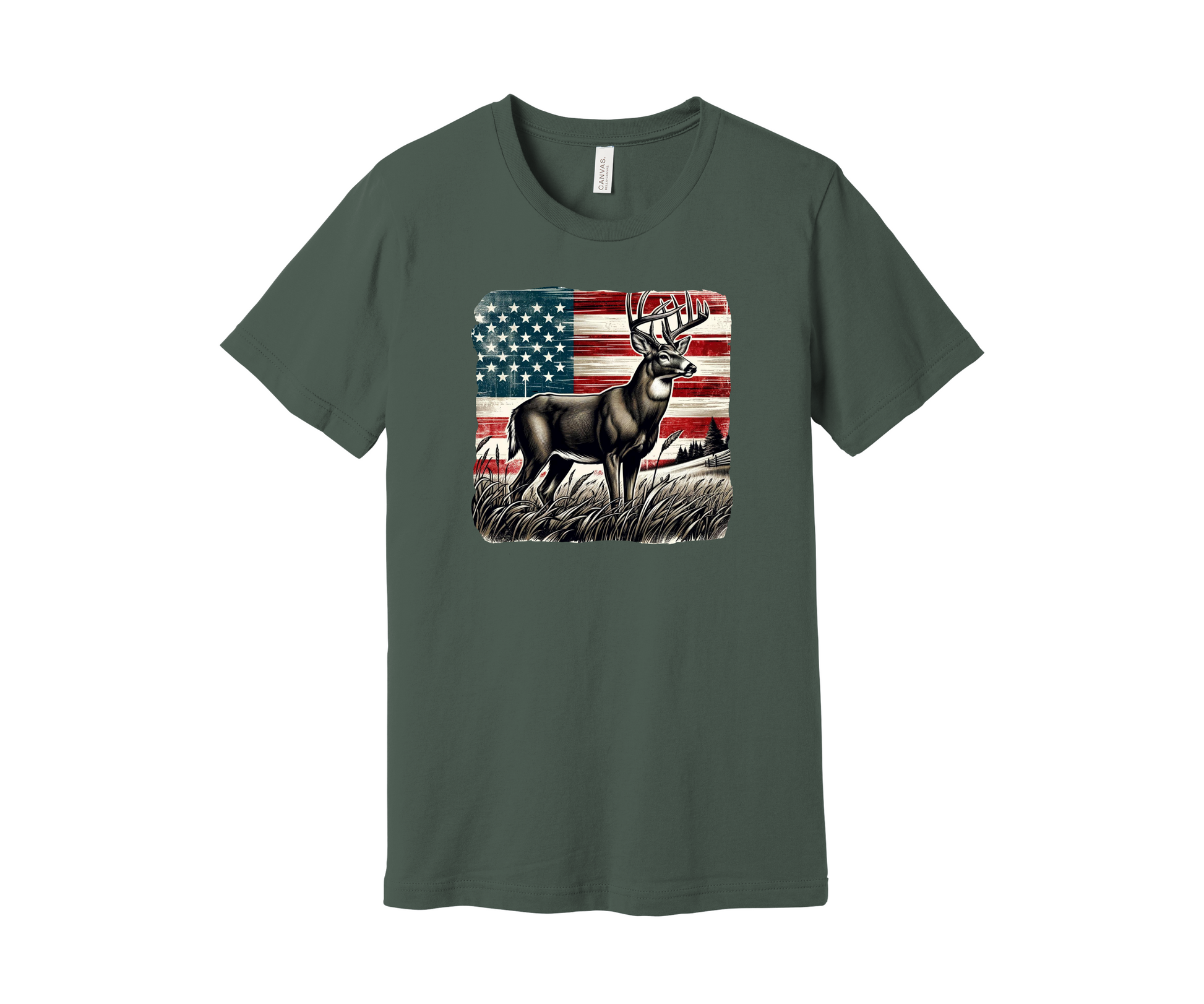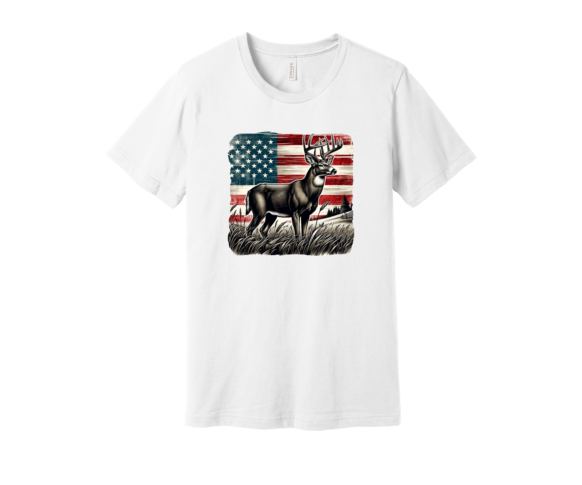 Show off your love for the great outdoors and American pride with the Bella + Canvas 6001 Shirt, featuring a striking image of an American flag with a deer silhouette.