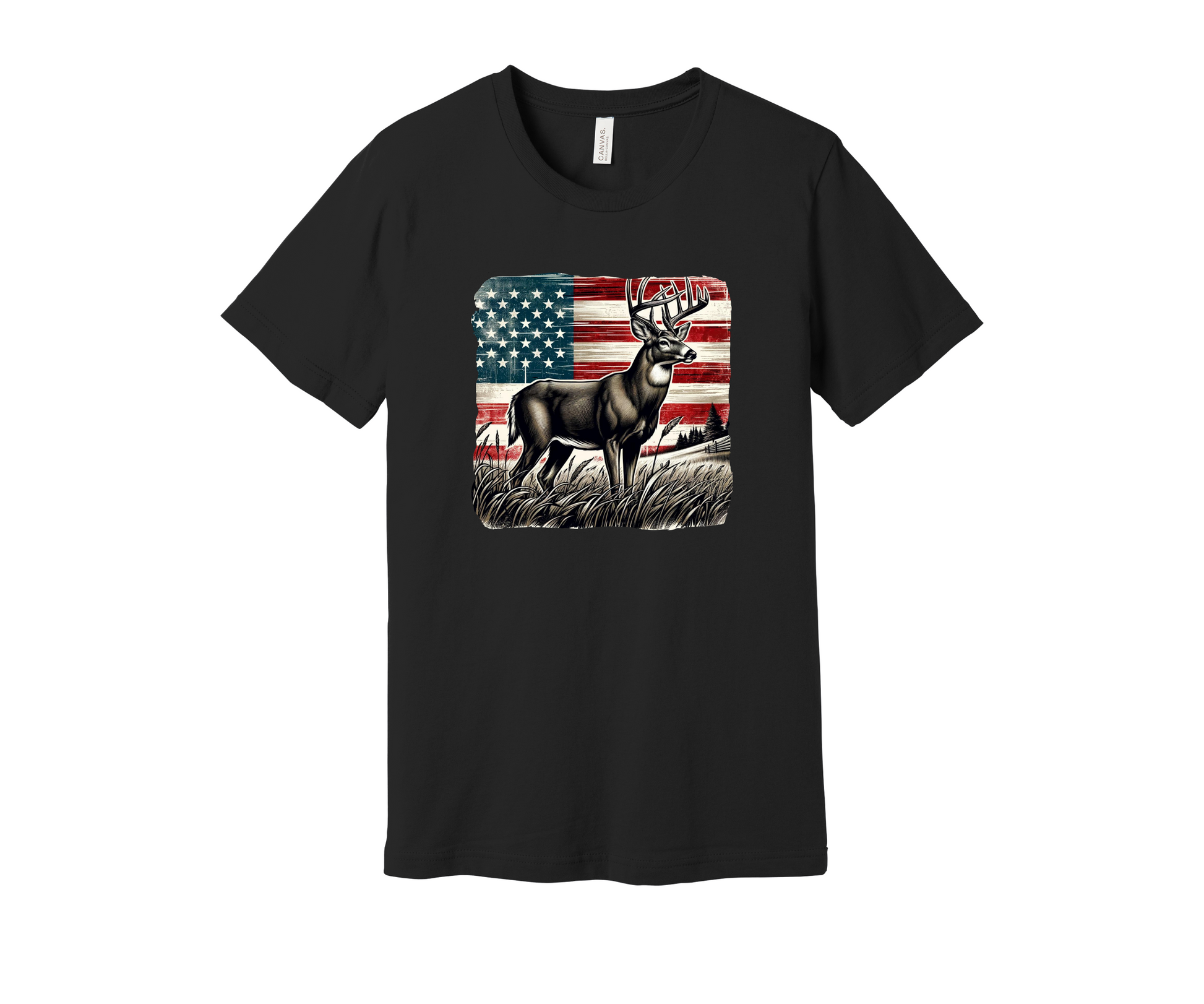 Design: This shirt merges patriotism with a passion for wildlife, showcasing a bold American flag with the silhouette of a majestic deer. Whether you're a proud hunter, nature enthusiast, or simply love unique patriotic designs, this shirt is perfect for any occasion that calls for a statement piece with a rugged touch.
