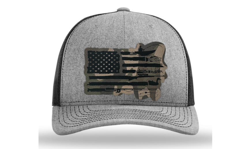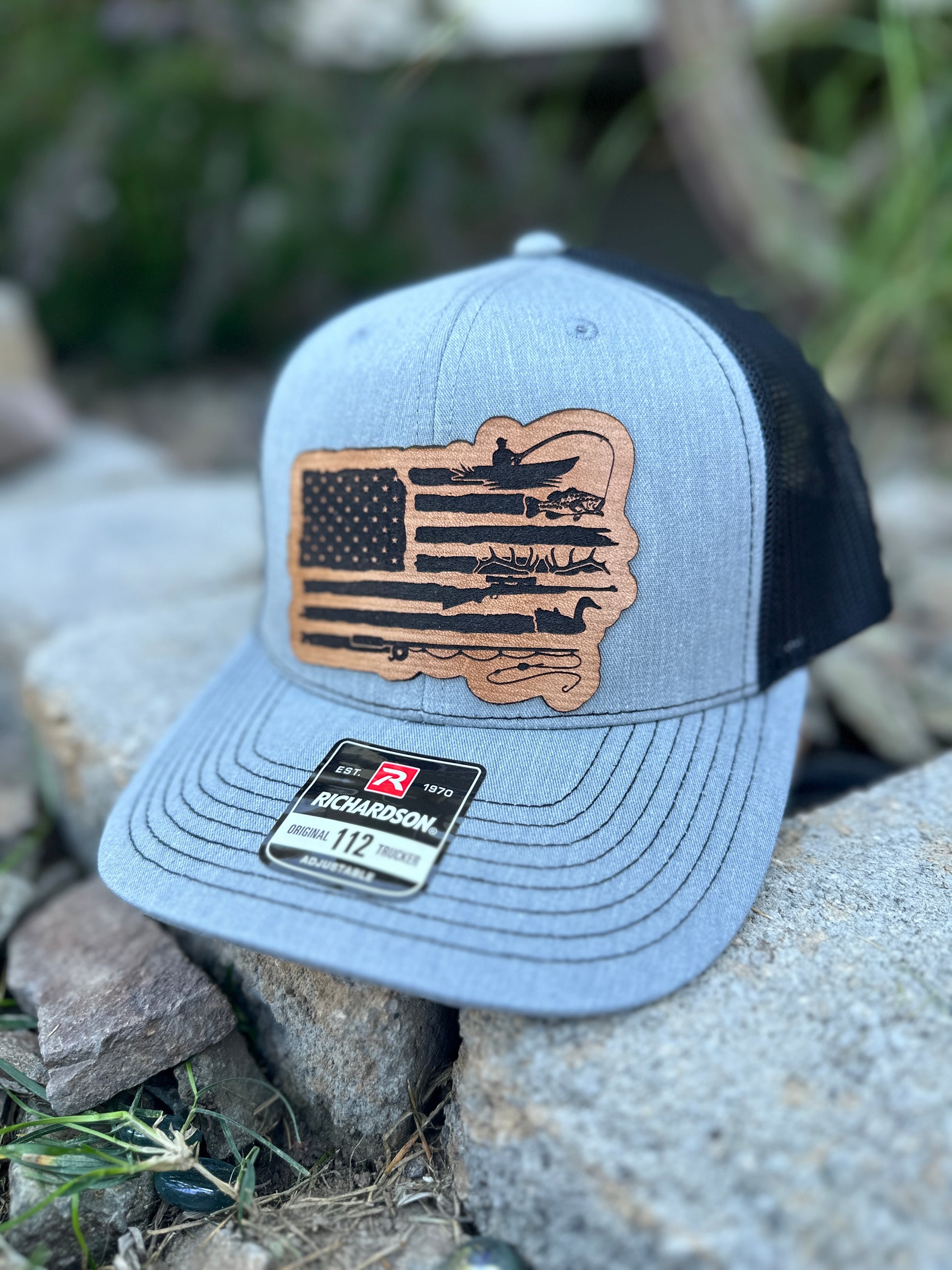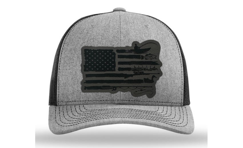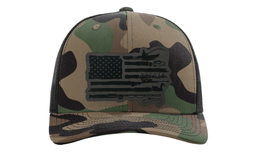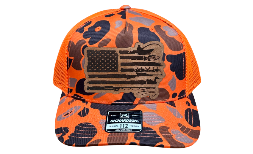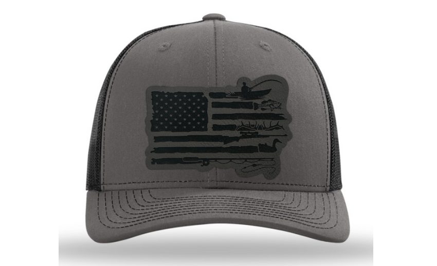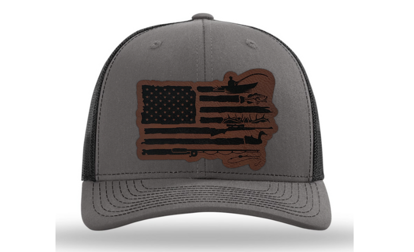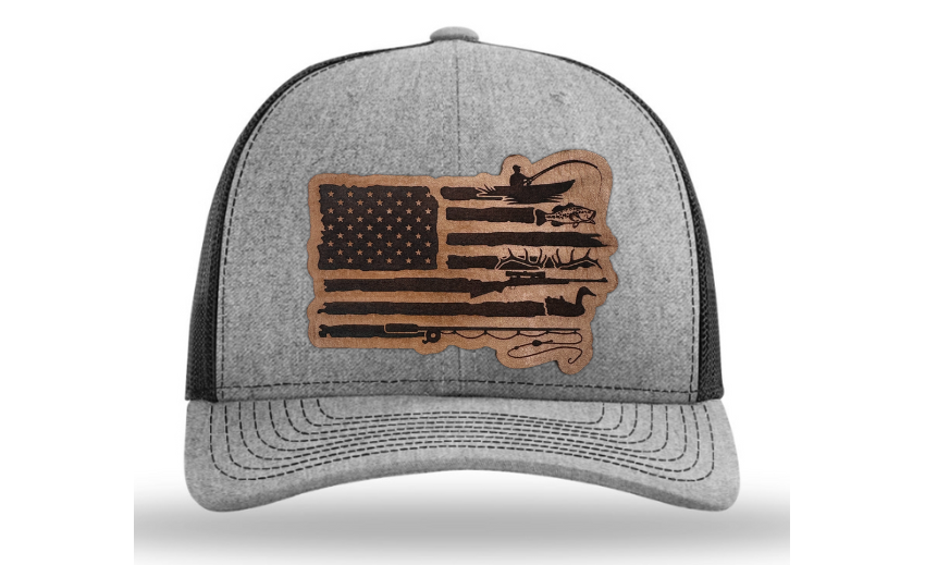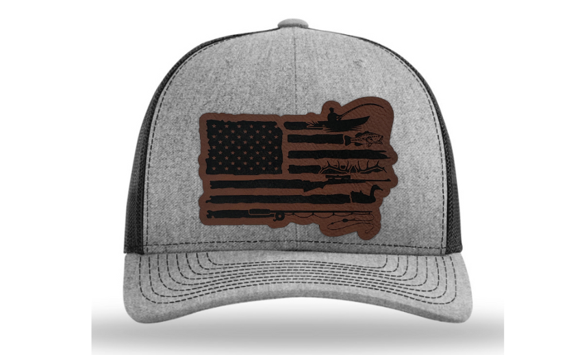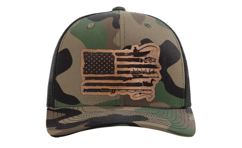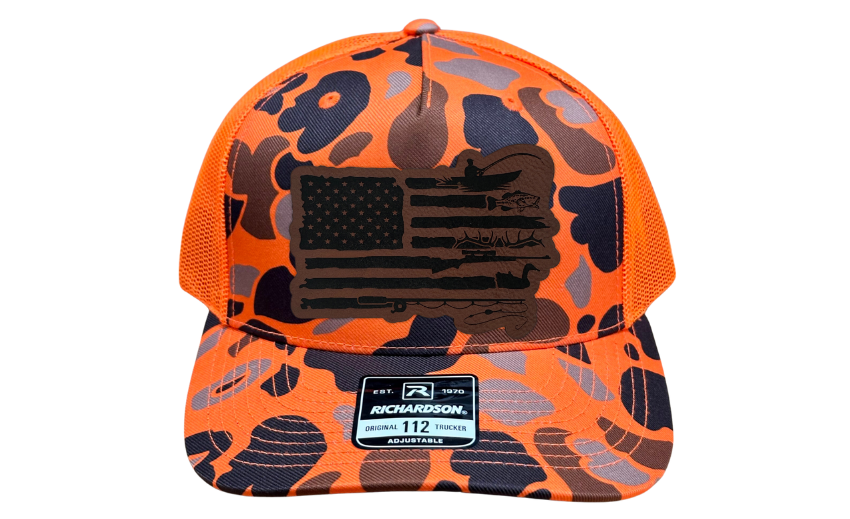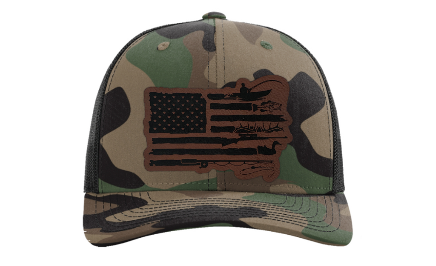 Crafted with precision and comfort in mind, the Richardson 112 Snapback offers an adjustable fit, while the FlexFit L/XL provides a snug and flexible feel. The defining feature of this hat is its meticulously crafted American flag patch, adorned with images of fishing and hunting at the end of each stripe. Available in Genuine Leather, Rawhide Leatherette, Grey Leatherette, and Camo Leatherette, this emblem symbolizes the freedom to pursue the great outdoors.