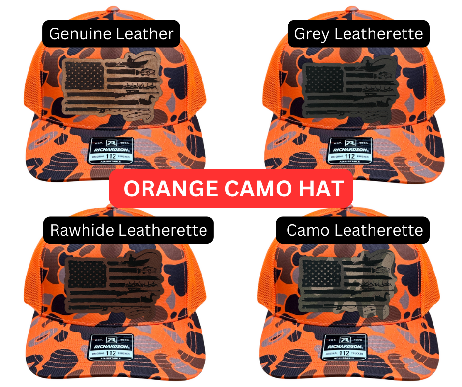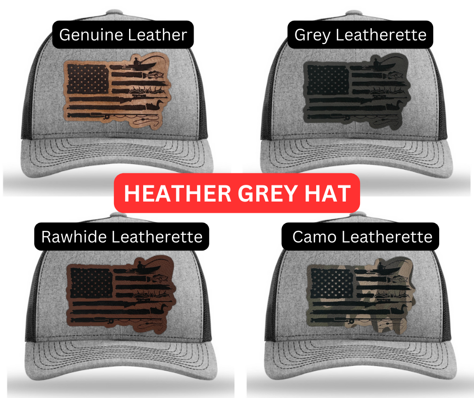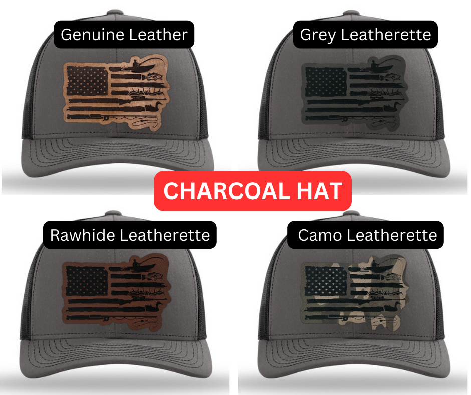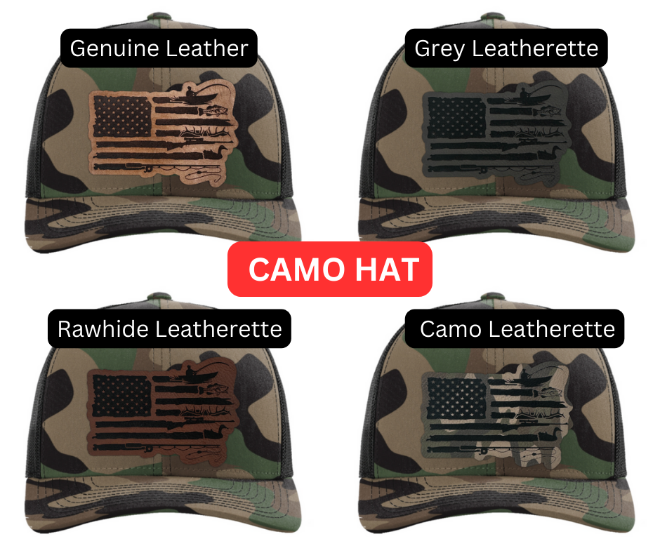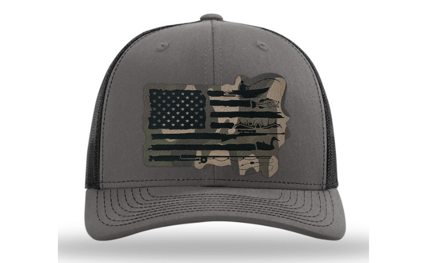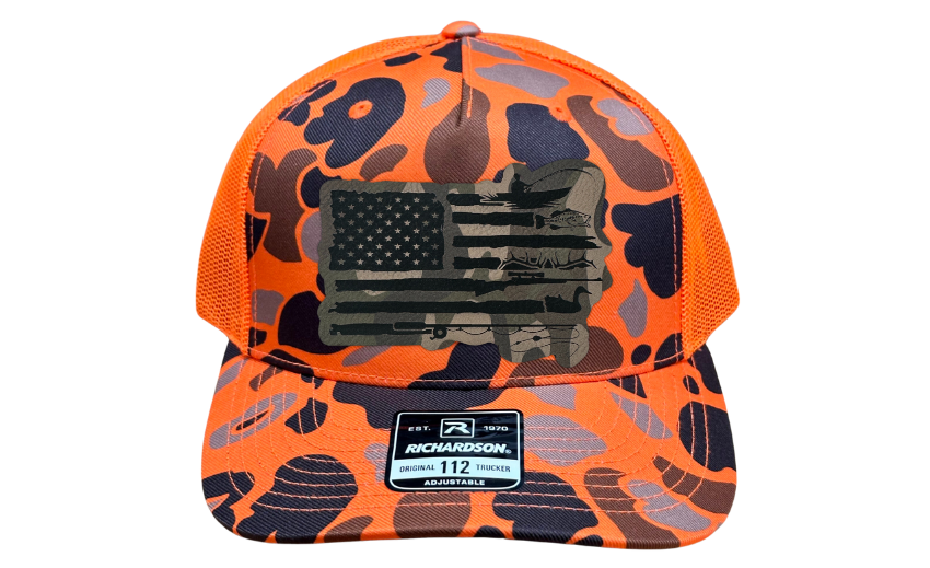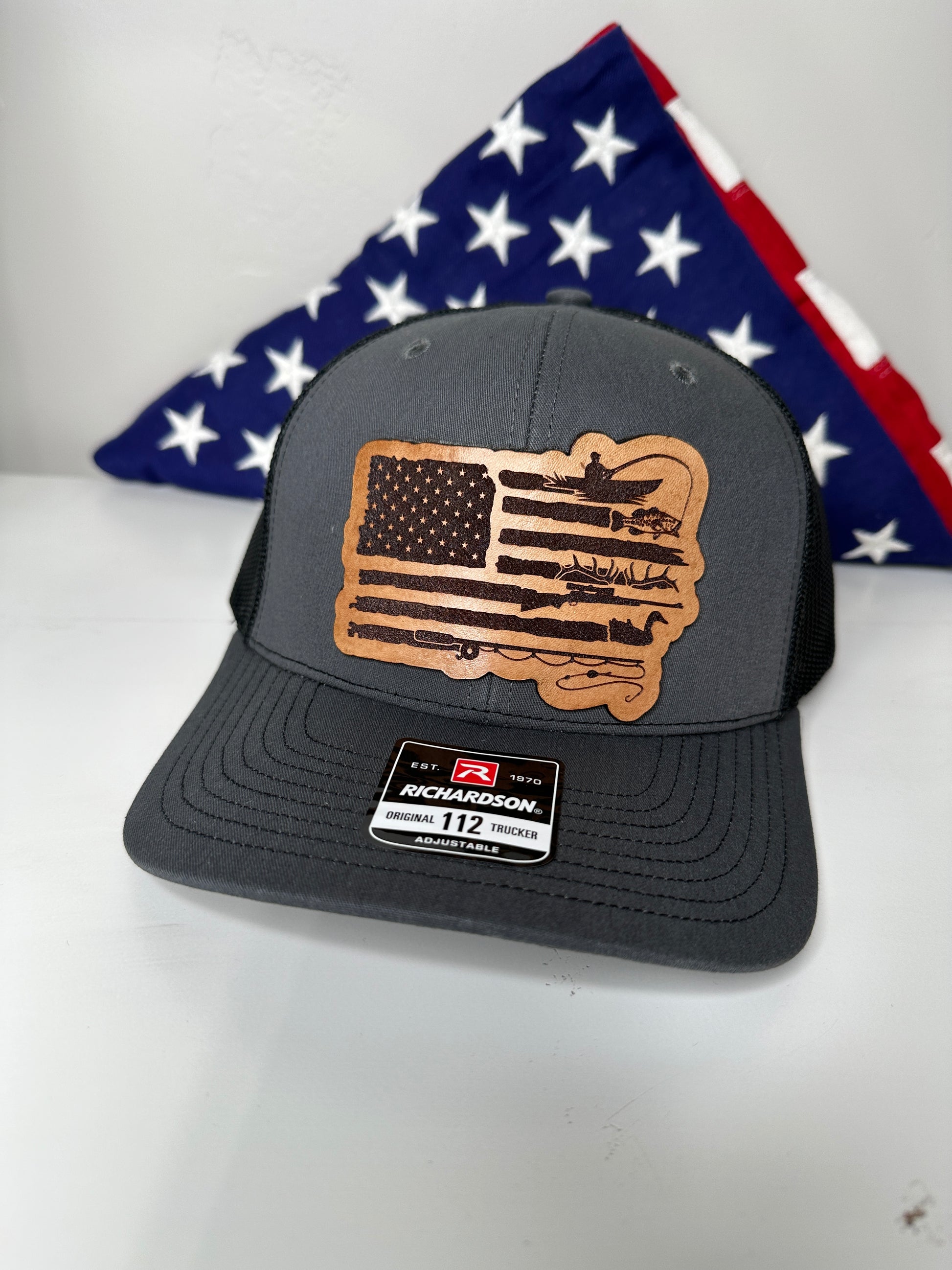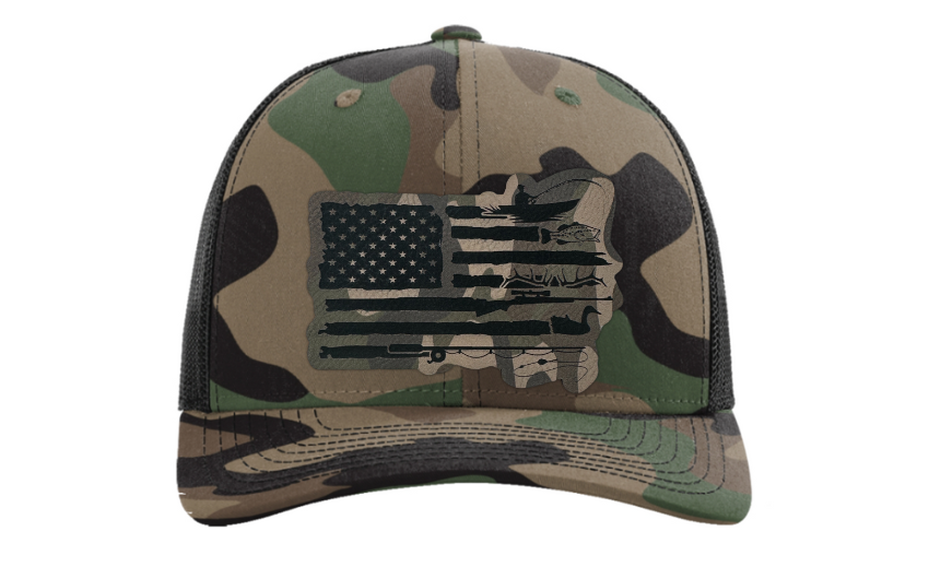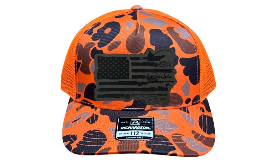 Crafted with precision and comfort in mind, the Richardson 112 Snapback offers an adjustable fit, while the FlexFit L/XL provides a snug and flexible feel. The defining feature of this hat is its meticulously crafted American flag patch, adorned with images of fishing and hunting at the end of each stripe. Available in Genuine Leather, Rawhide Leatherette, Grey Leatherette, and Camo Leatherette, this emblem symbolizes the freedom to pursue the great outdoors.