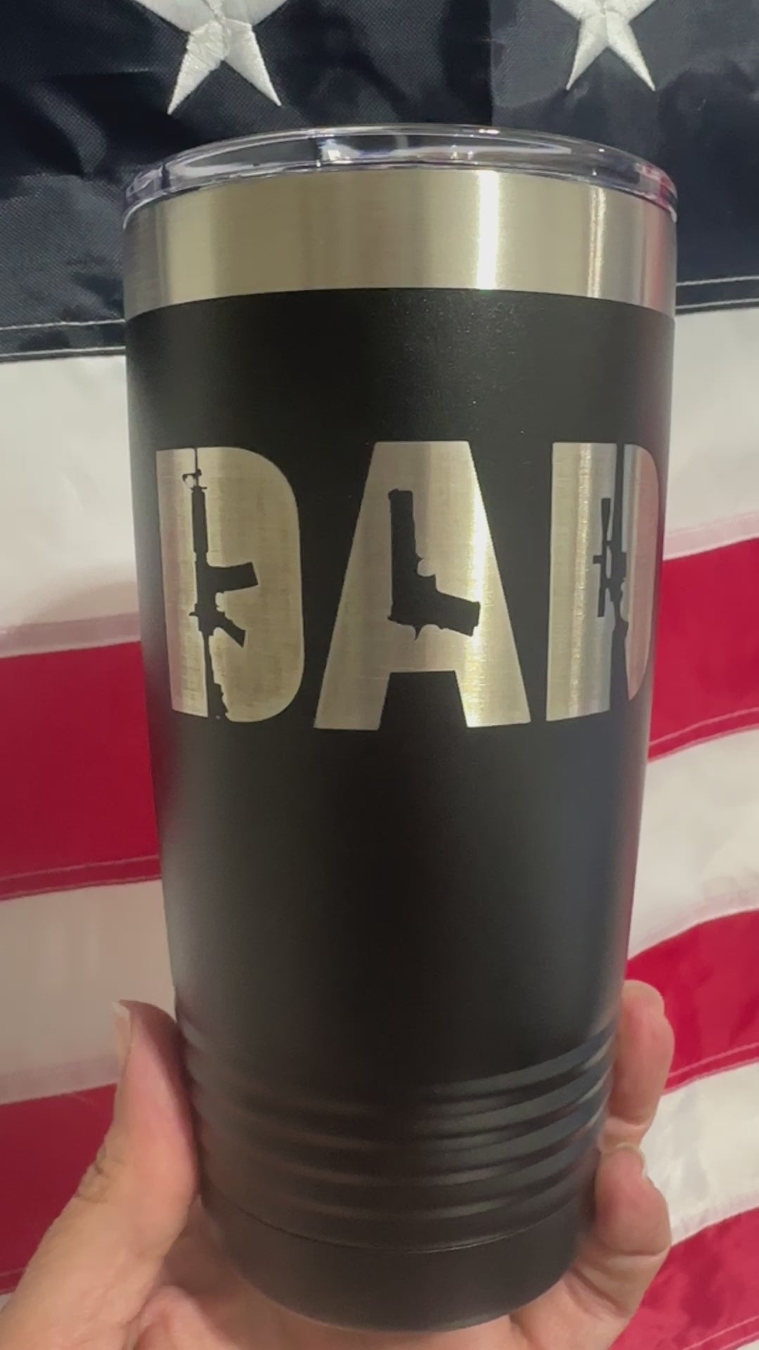 Introducing the 20 OZ Insulated Tumbler with a unique laser-engraved "DAD" design, featuring intricate gun imagery within the letters. This premium tumbler is the perfect blend of rugged style and practical functionality, making it an ideal gift for the dad who appreciates both quality and a touch of personality in his drinkware.