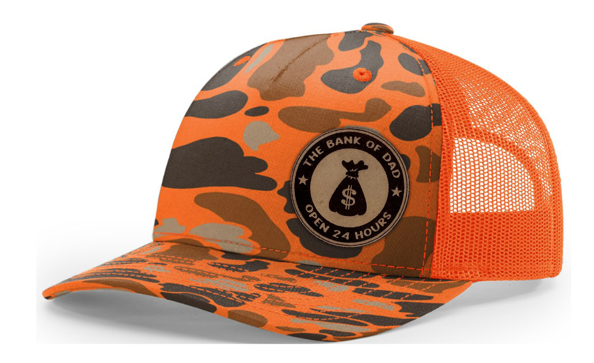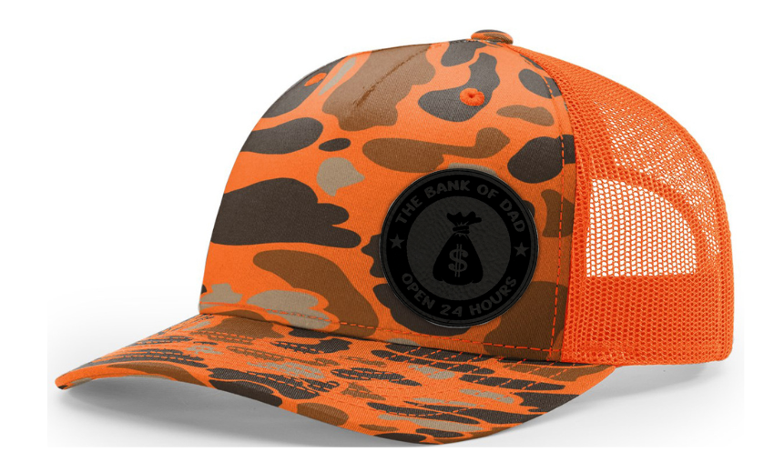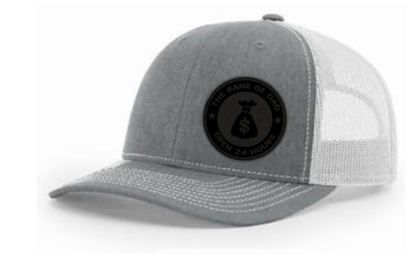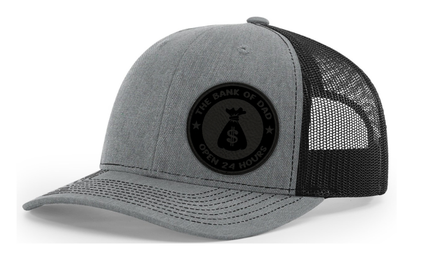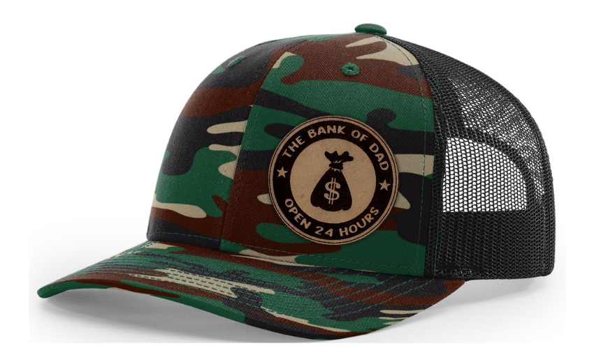 Introducing our Richardson 112 Snapback or FlexFit L/XL adorned with the "Bank of Dad - Open 24 Hours" Patch – the ultimate tribute to the endless support and love provided by every dad out there. Available in a variety of stylish color combinations including Charcoal/Black, Heather Grey/Black, Khaki/White, Heather Grey/Grey, Green Camo, and Orange Camo, there's a hat to match every dad's unique style.
