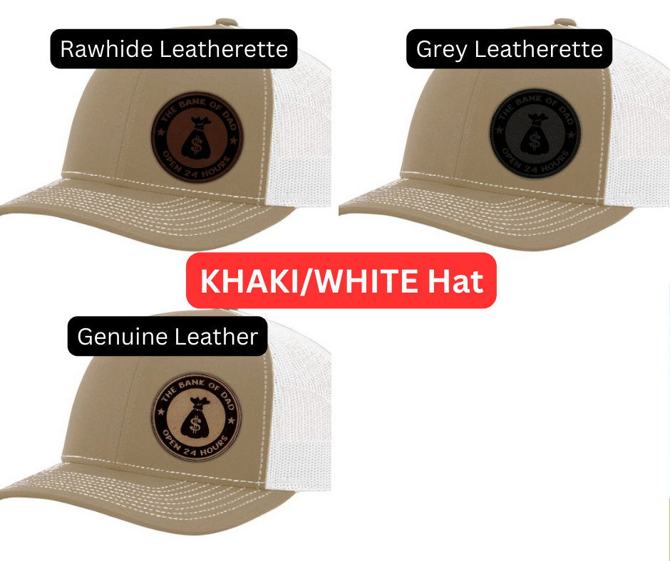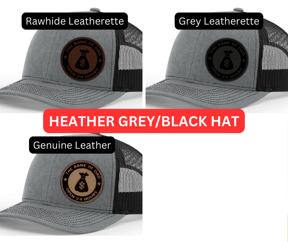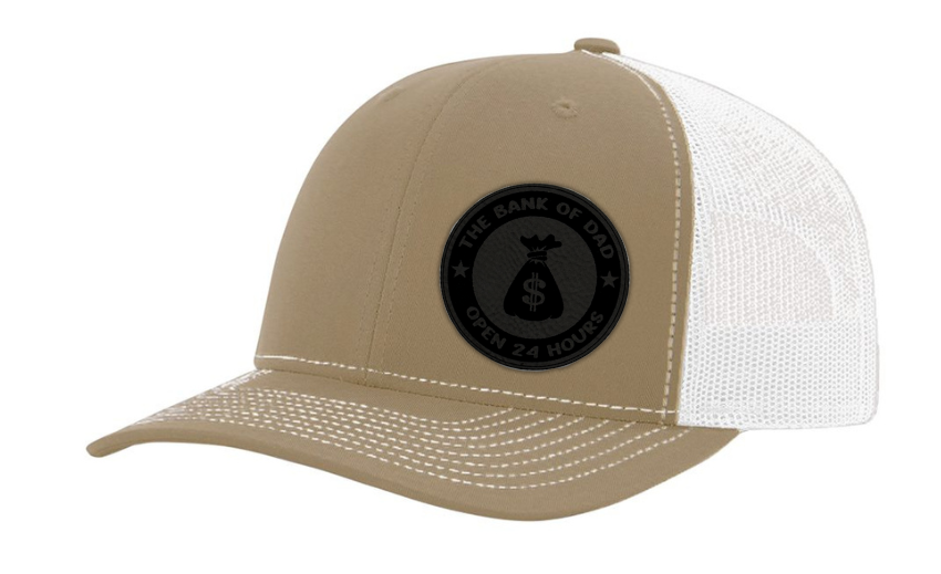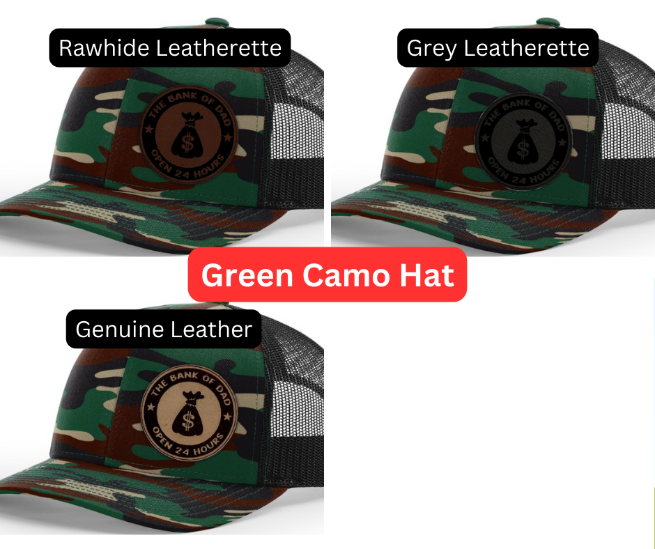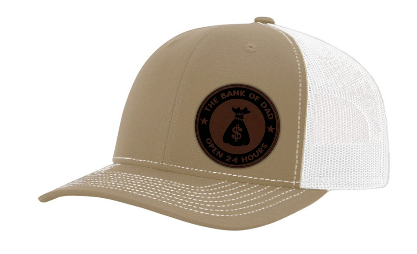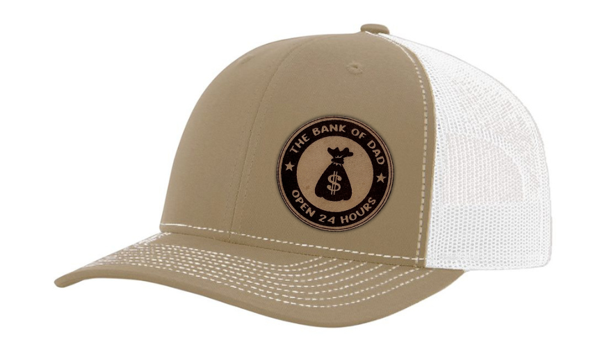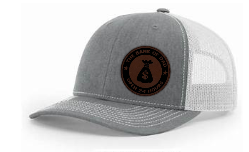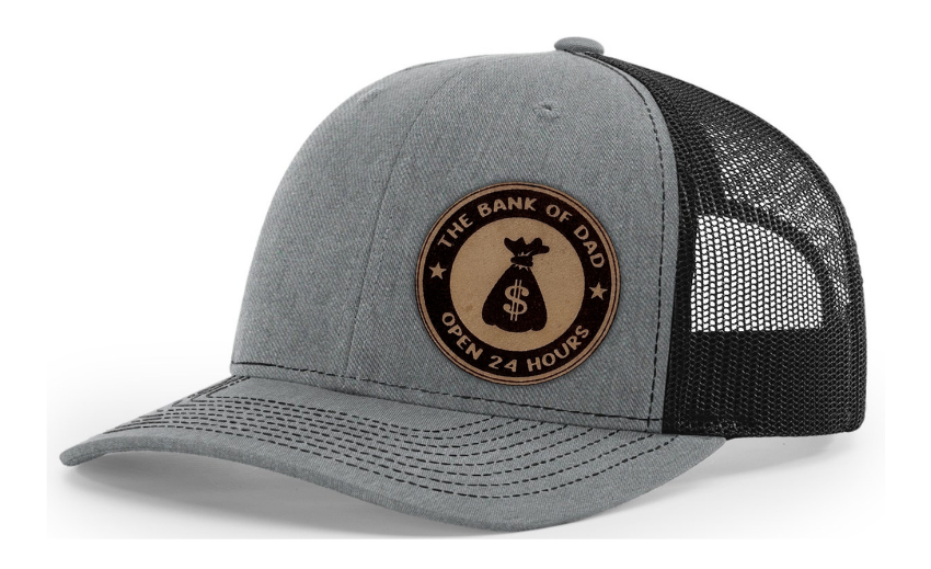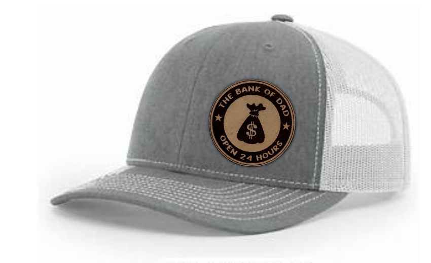 Crafted with premium materials, this hat is not just a fashion statement but a heartfelt acknowledgment of the invaluable role dads play in our lives. The laser engraved and cut patch, available in Genuine Leather, Rawhide Leatherette, and Grey Leatherette, features the iconic phrase "Bank of Dad - Open 24 Hours," highlighting the unwavering commitment and generosity of fathers everywhere.