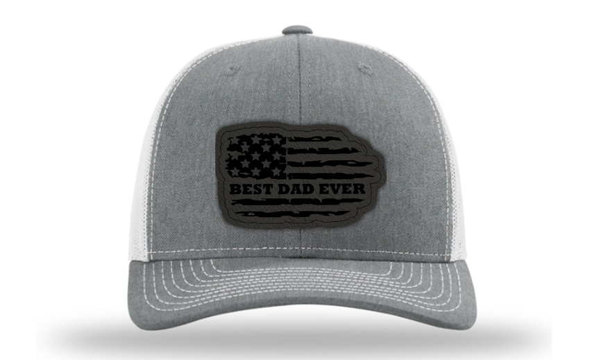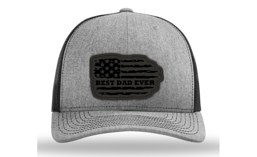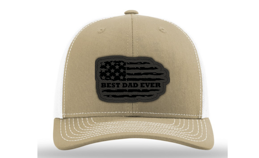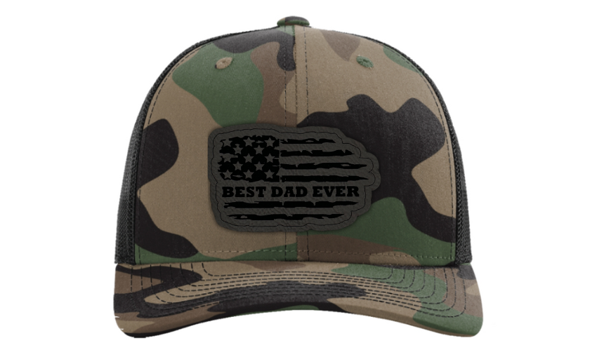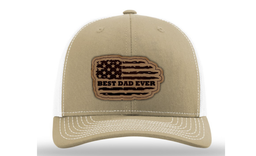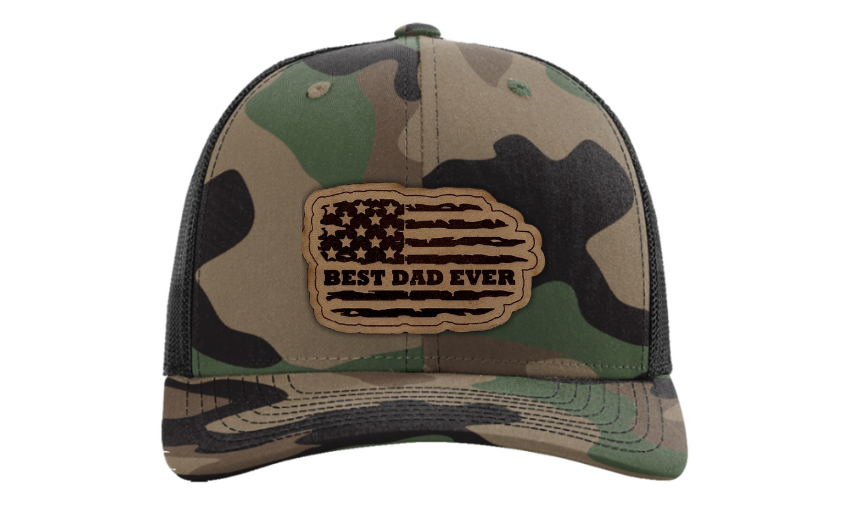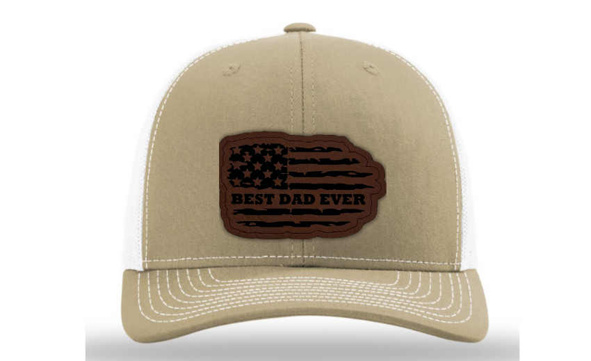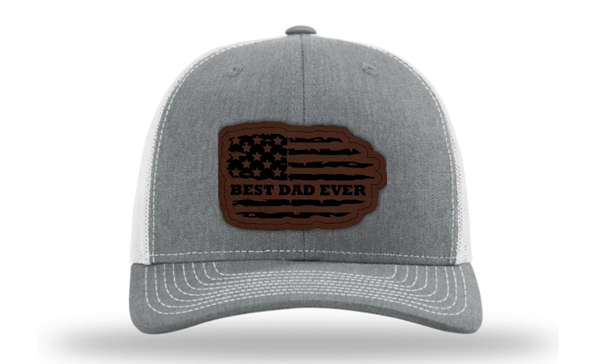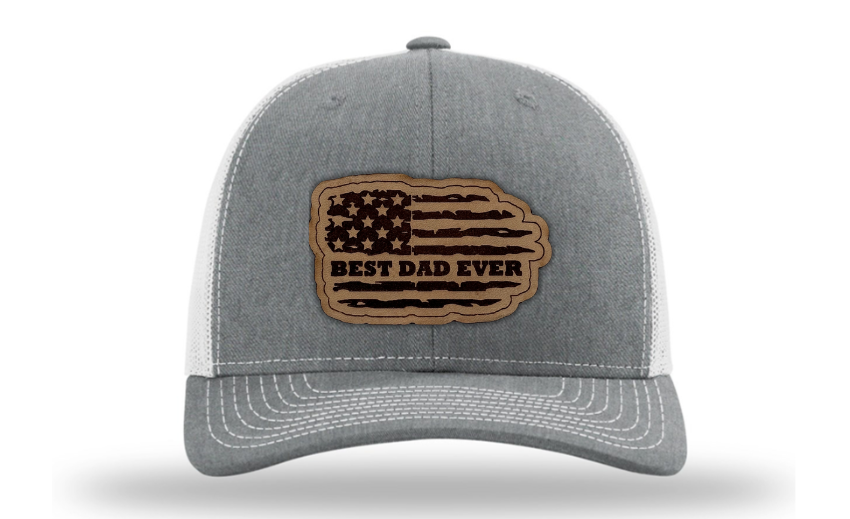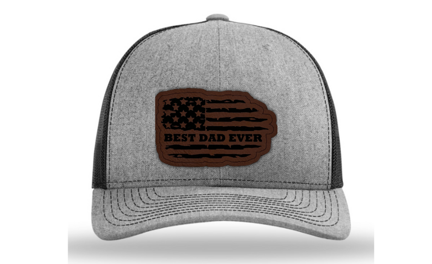 Crafted with premium materials, this hat is not just a fashion accessory but a heartfelt tribute to the best dads in the world. The laser engraved and cut patch, available in Genuine Leather, Rawhide Leatherette, and Grey Leatherette, features the timeless phrase "Best Dad Ever" set against the backdrop of a tattered American flag, symbolizing the enduring strength and resilience of fatherhood.