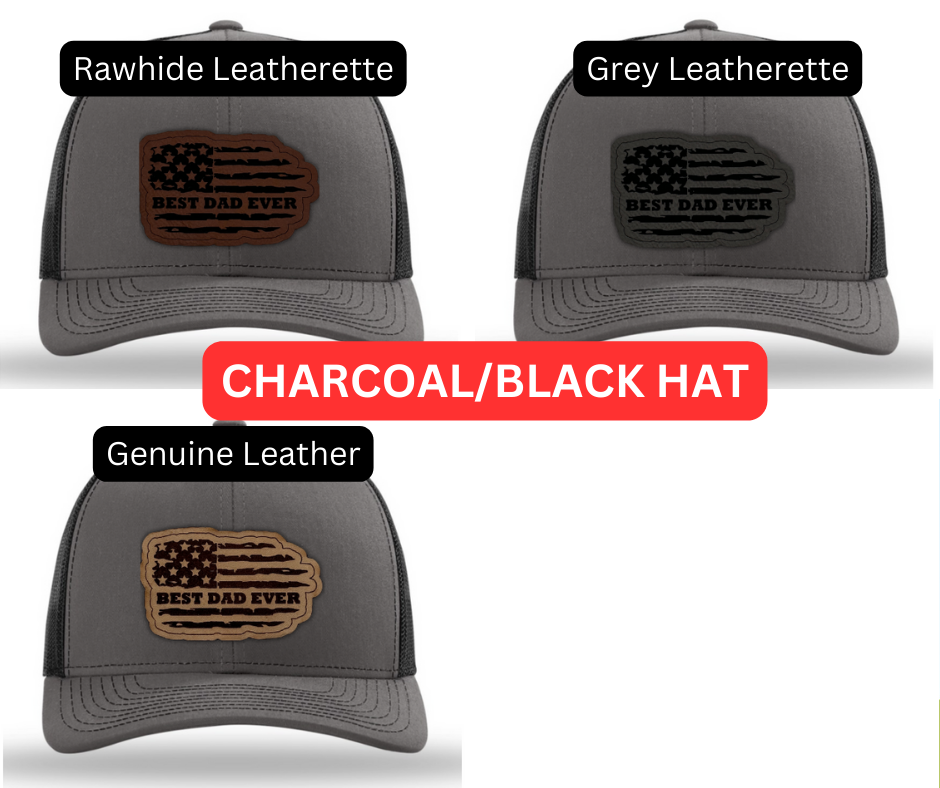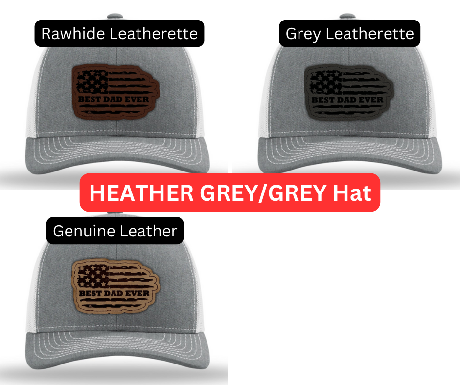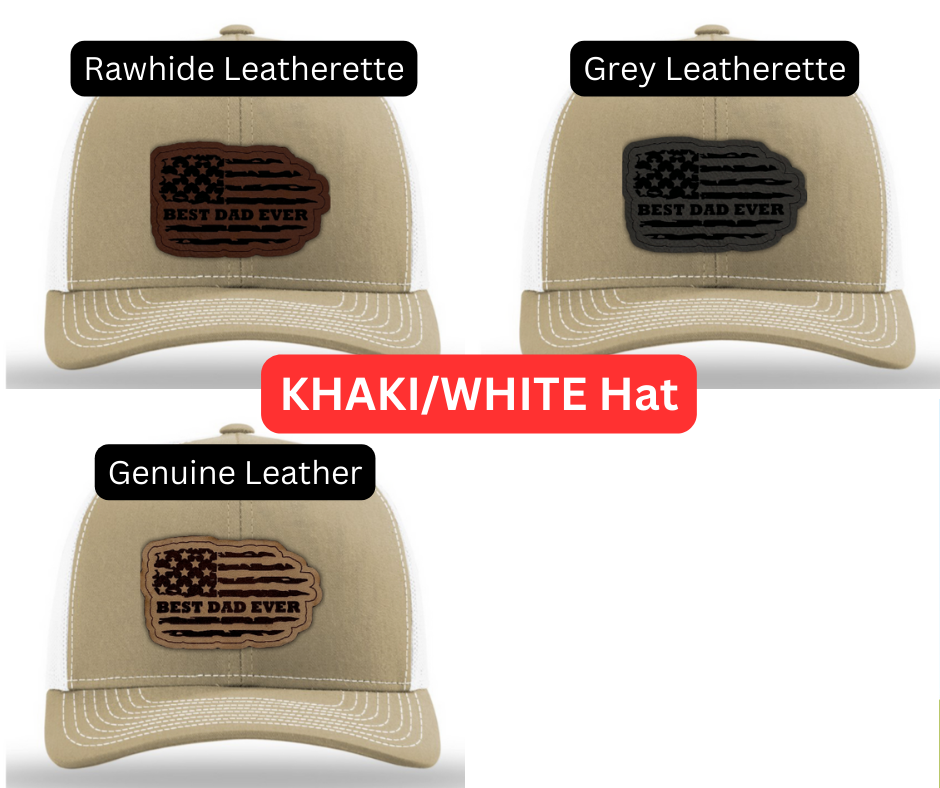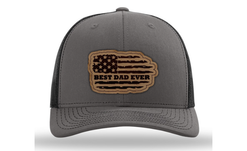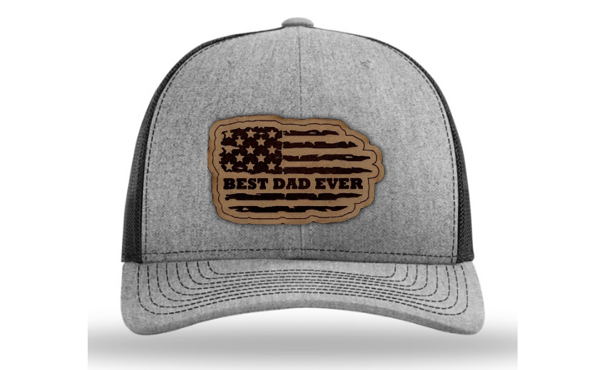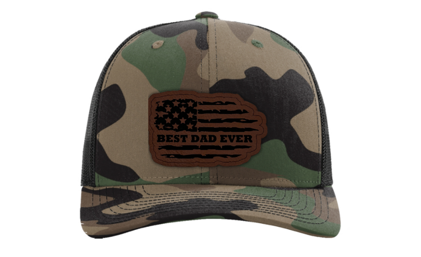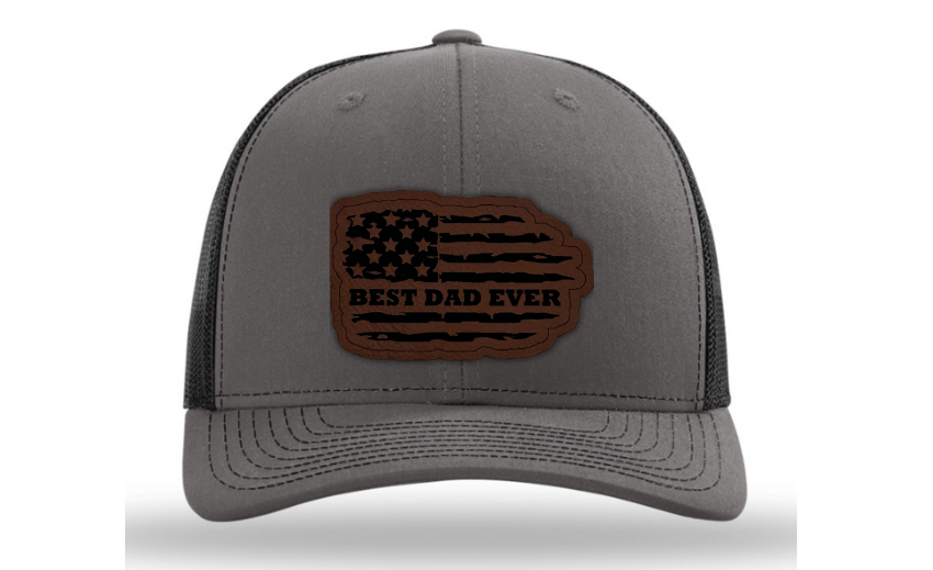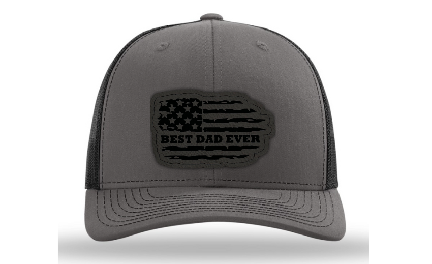 Crafted with premium materials, this hat is not just a fashion accessory but a heartfelt tribute to the best dads in the world. The laser engraved and cut patch, available in Genuine Leather, Rawhide Leatherette, and Grey Leatherette, features the timeless phrase "Best Dad Ever" set against the backdrop of a tattered American flag, symbolizing the enduring strength and resilience of fatherhood.