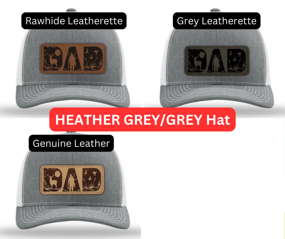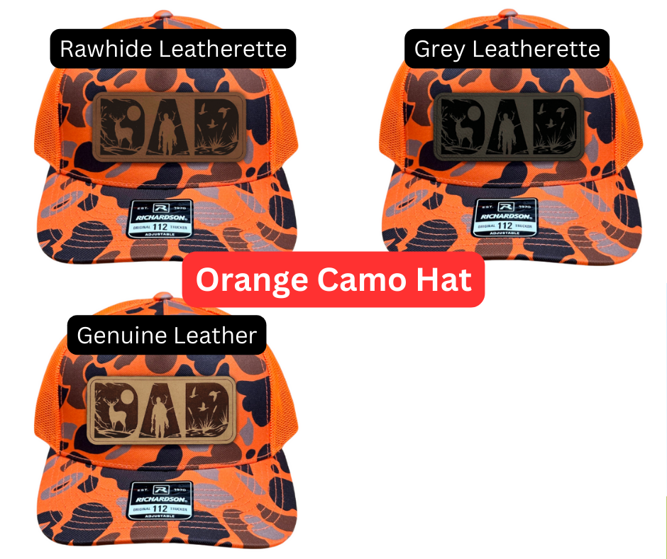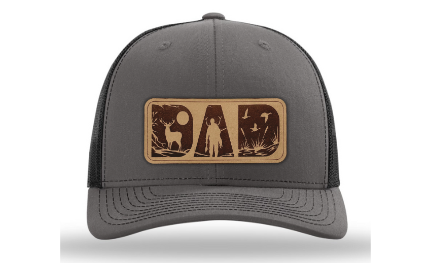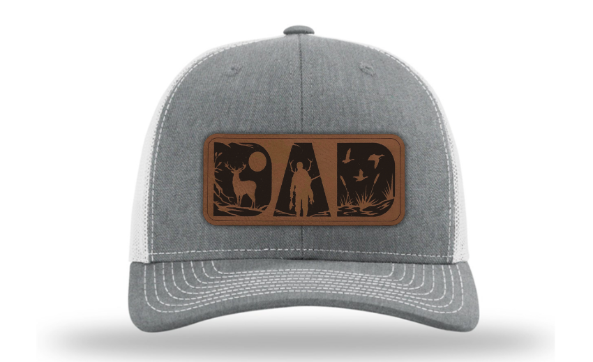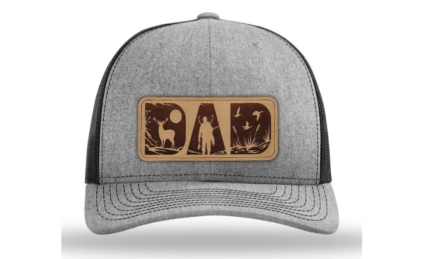 Design: Genuine leather patch featuring "DAD" with integrated silhouettes of a hunter, deer, and ducks.