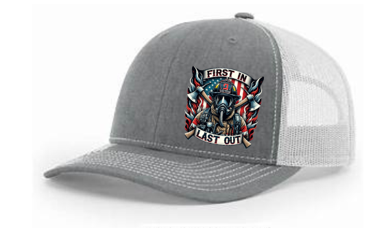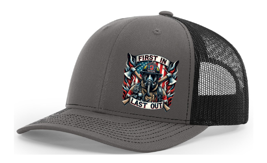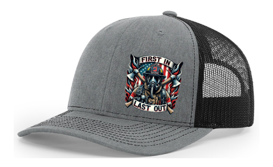 Introducing the Richardson 112 Snapback or FlexFit L/XL Hat with a striking full-color image featuring a courageous fireman and the powerful phrase "First In, Last Out." This hat is perfect for those who honor the bravery and dedication of first responders. The design captures the essence of selfless service, with vivid details that stand out against a variety of stylish hat colors, including Charcoal/Black, Heather Grey/Black, Khaki/White, Heather Grey/Grey, Green Camo, and Orange Camo. The image and message are laser-engraved on your choice of genuine leather, rawhide leatherette, or grey leatherette patch, creating a durable and eye-catching accessory.
