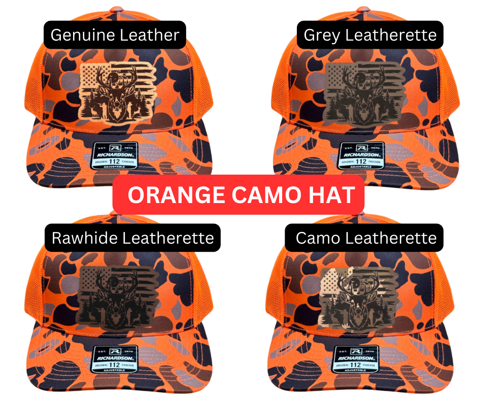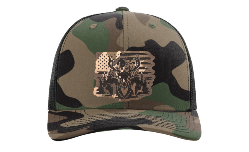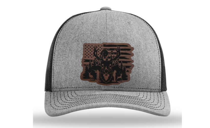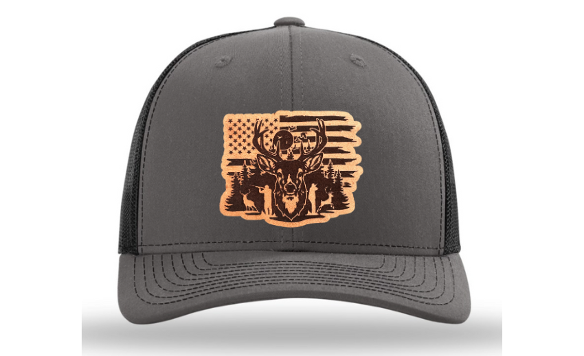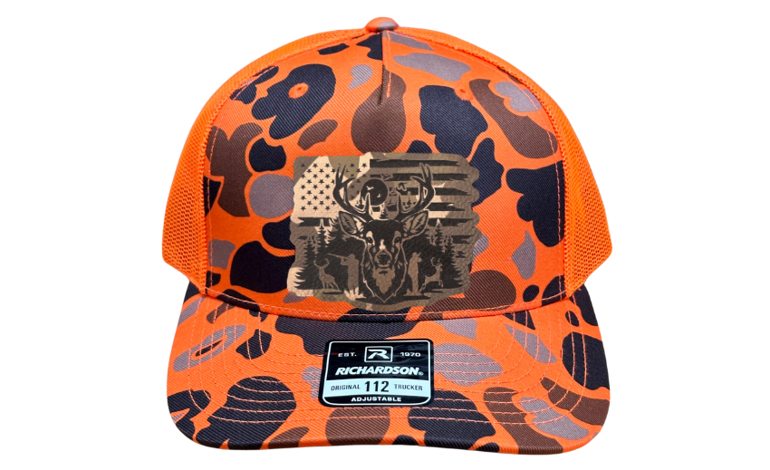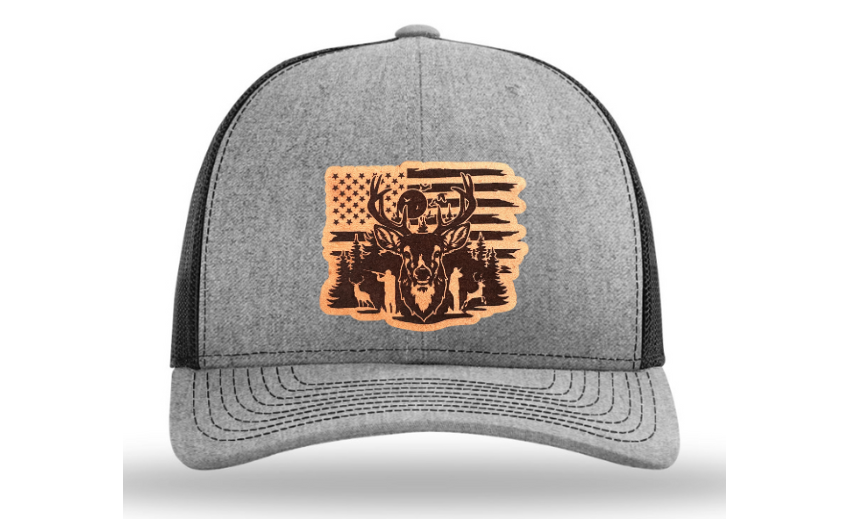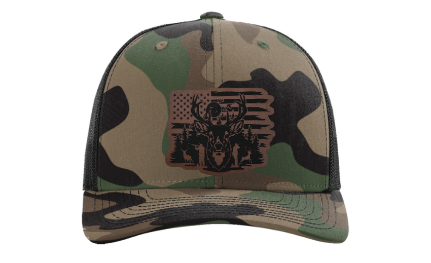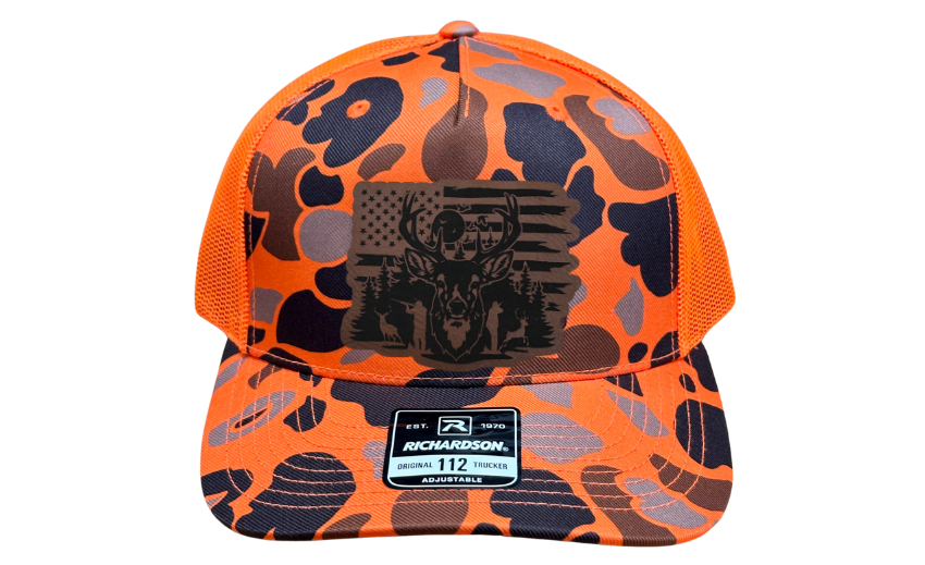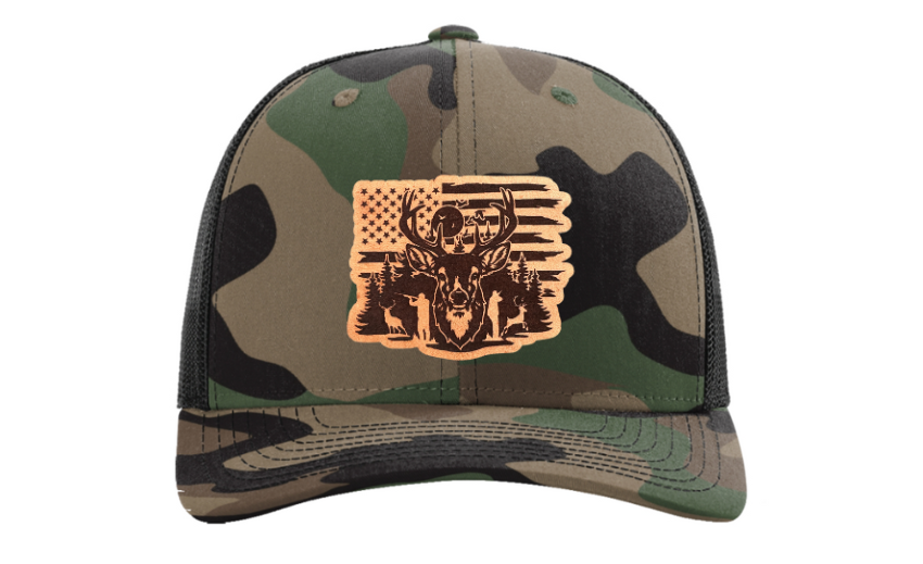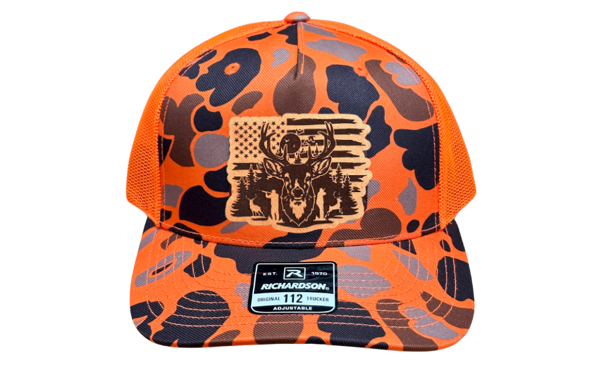 Crafted with precision and comfort in mind, the Richardson 112 Snapback offers an adjustable fit, while the FlexFit L/XL provides a snug and flexible feel. The defining feature of this hat is its meticulously crafted patch, available in Genuine Leather, Rawhide Leatherette, Grey Leatherette, and Camo Leatherette. The patch is a visual celebration of the American spirit, the thrill of the hunt, and the serene beauty of nature.