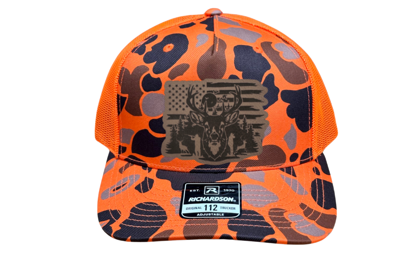 Introducing the Richardson 112 Snapback or FlexFit L/XL – a hat that captures the essence of the great outdoors, proudly featuring a patch that showcases the American flag as a backdrop to a scene of a hunter, deer, and ducks. Available in Charcoal, Heather Grey, Green Camo, and Orange Camo, each color provides a canvas for a hat that seamlessly blends patriotism with a love for hunting and wildlife.