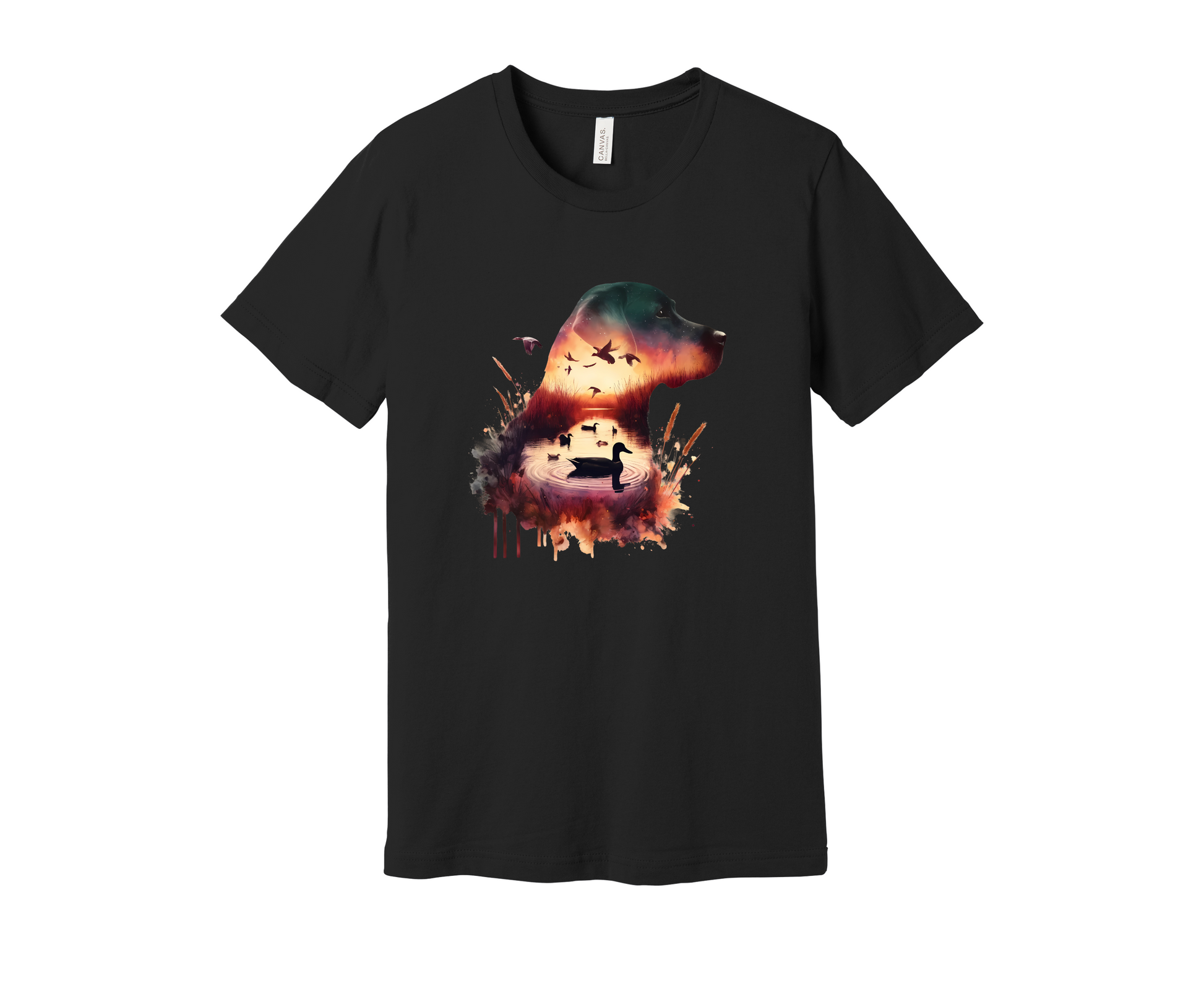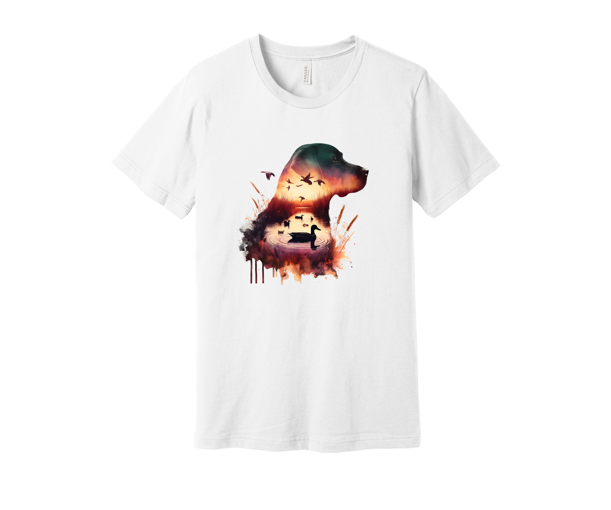 Capture the serene beauty of the hunt with the Bella + Canvas 6001 Shirt, featuring a stunning silhouette of a dog filled with images of ducks and a sunset.