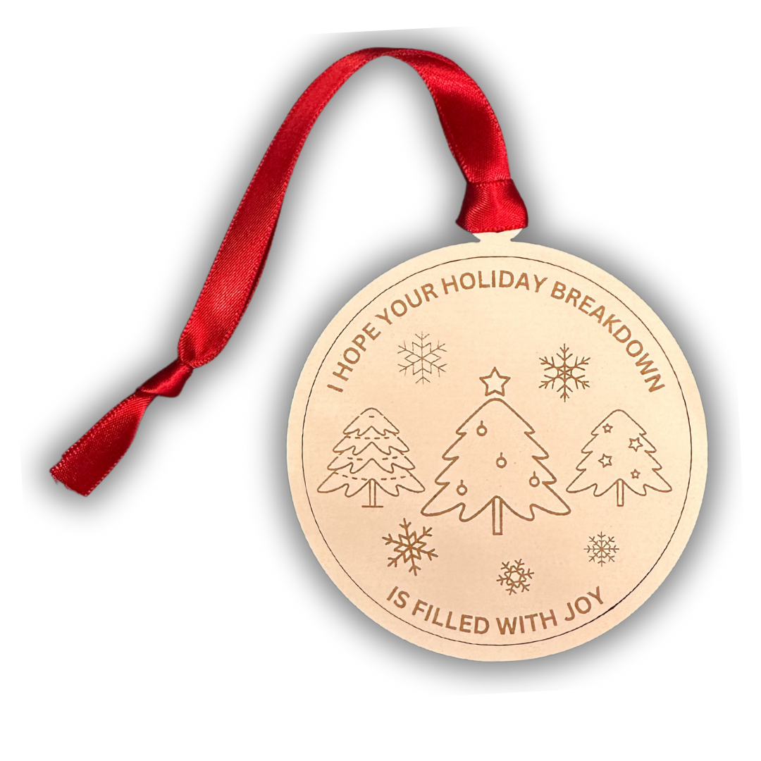 Add a touch of humor and heartfelt sentiment to your holiday decor with our "I Hope Your Holiday Breakdown is Filled with Joy" Christmas Ornament. Perfectly sized at 3 inches in diameter, this charming ornament is the perfect blend of festive cheer and light-hearted fun, making it a unique addition to any Christmas tree.