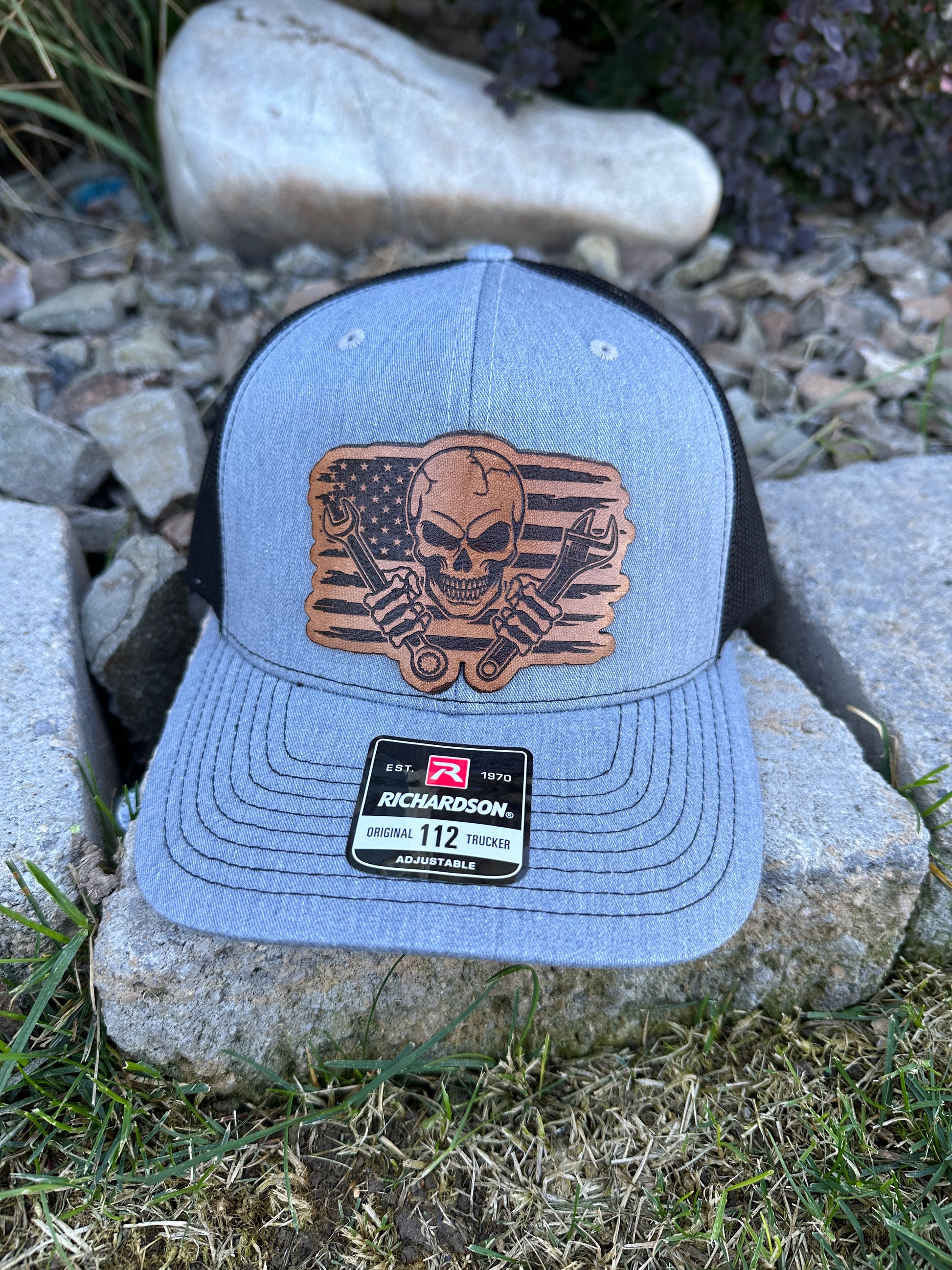🧢 Skull & Wrench Leather Patch Trucker Hat – Richardson 112