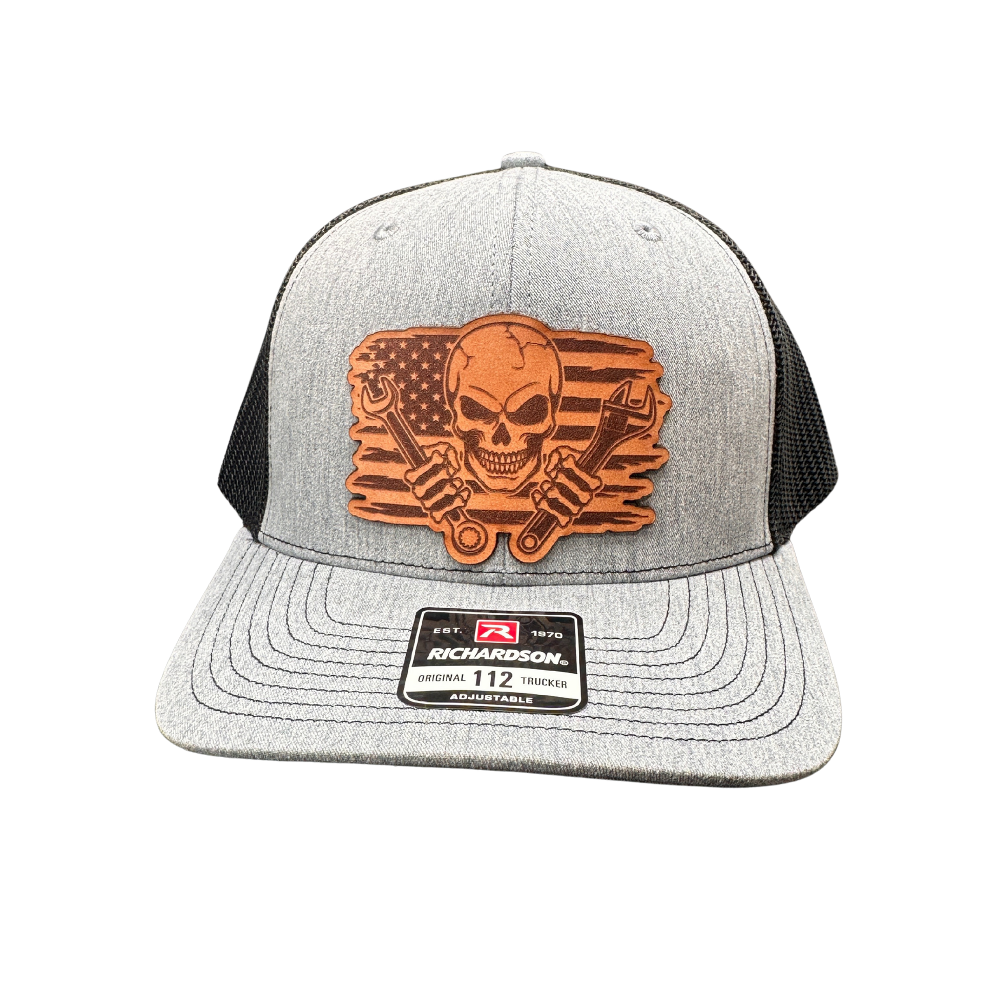 This Skull and Wrench Richardson 112 Trucker Hat is built for those who live life in the garage, on the job site, or out on the open road. Featuring a premium engraved leather patch with a rugged skull-and-wrench design over a distressed American flag, this hat blends attitude with craftsmanship.