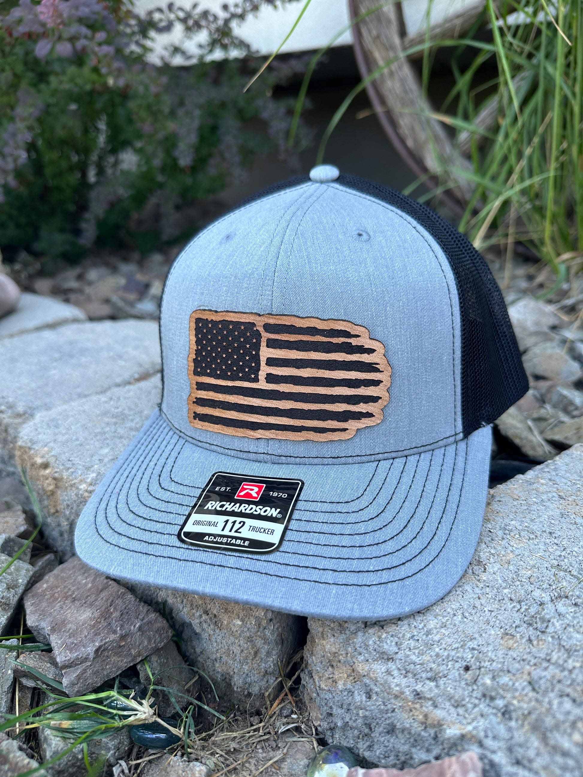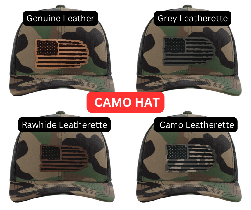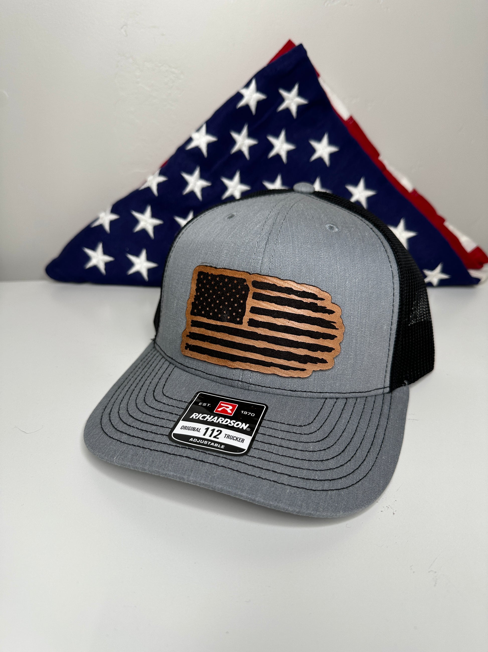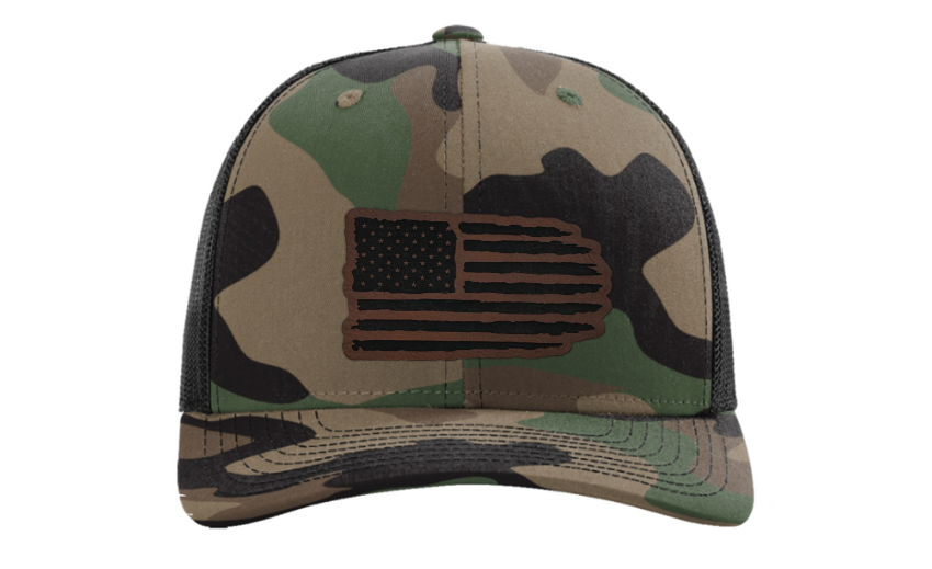 Crafted with precision and comfort in mind, the Richardson 112 Snapback offers an adjustable fit, while the FlexFit L/XL provides a snug and flexible feel. The defining feature of this hat is its meticulously crafted tattered American flag patch, available in Genuine Leather, Rawhide Leatherette, Grey Leatherette, and Camo Leatherette. This emblem pays homage to the enduring spirit of the United States and the strength found in weathering the storms.