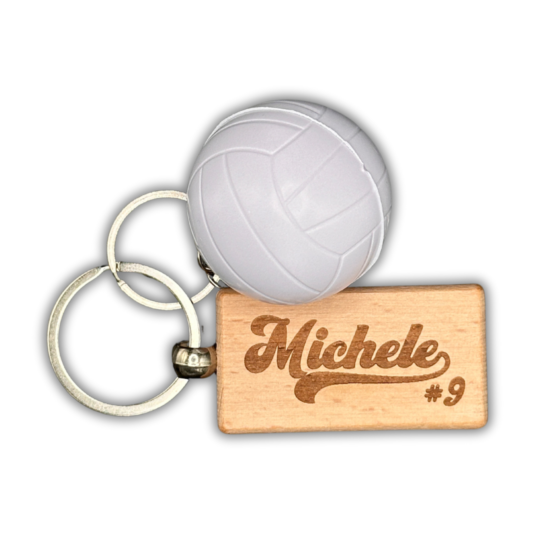 Ideal for volleyball players, coaches, and fans, this keychain combines fun and functionality. The volleyball stress ball is great for relieving stress or practicing your grip, while the personalized wooden tag adds a unique touch that makes it easy to spot your keys or gear.