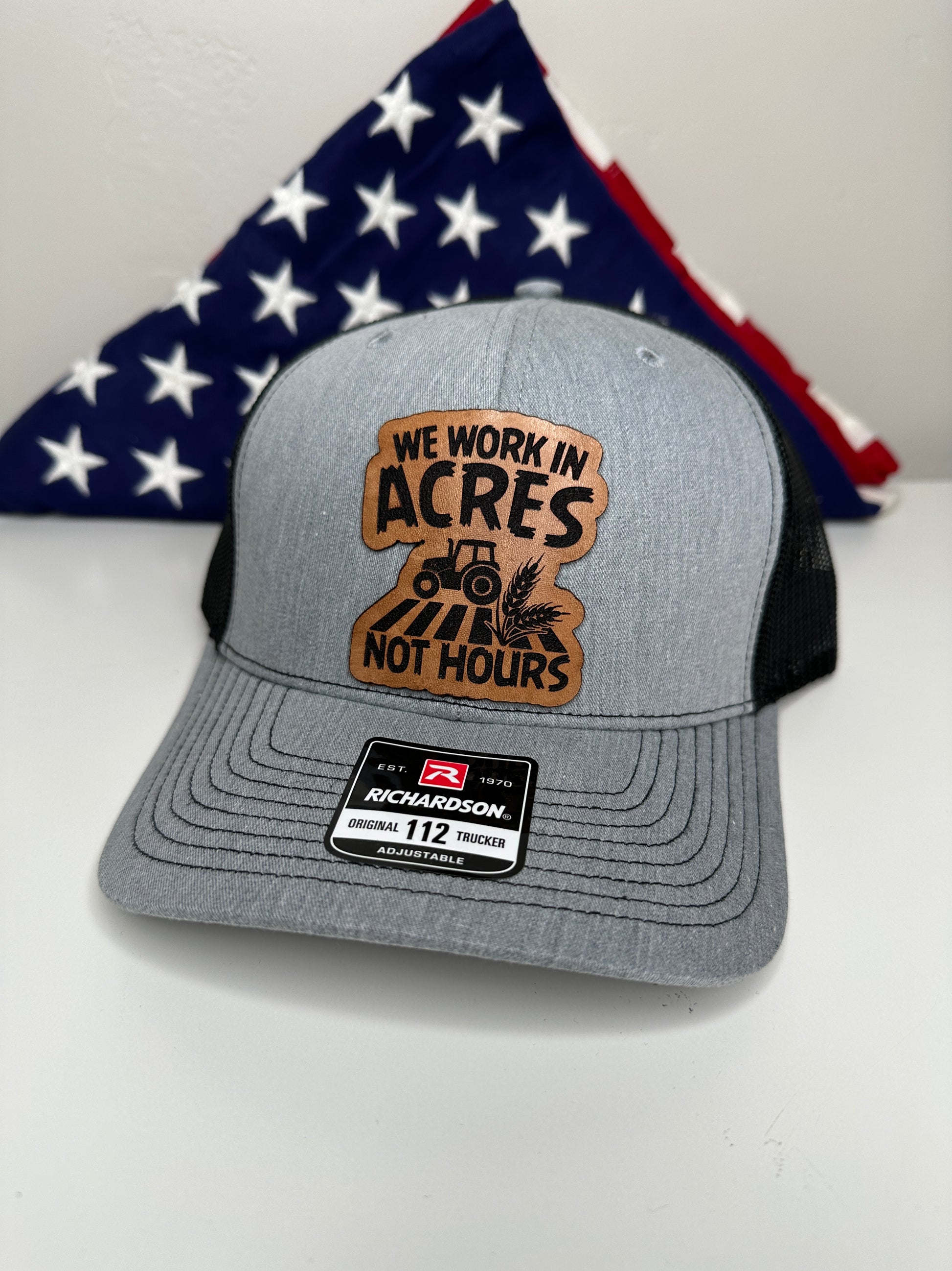 The heart of this hat lies in its patch, where the words "We Work in Acres Not Hours" are proudly displayed, symbolizing the commitment to agriculture, farming, and the enduring connection between labor and the land. It's a visual representation of the timeless ethos shared by those who understand that success is measured in acres, not hours.